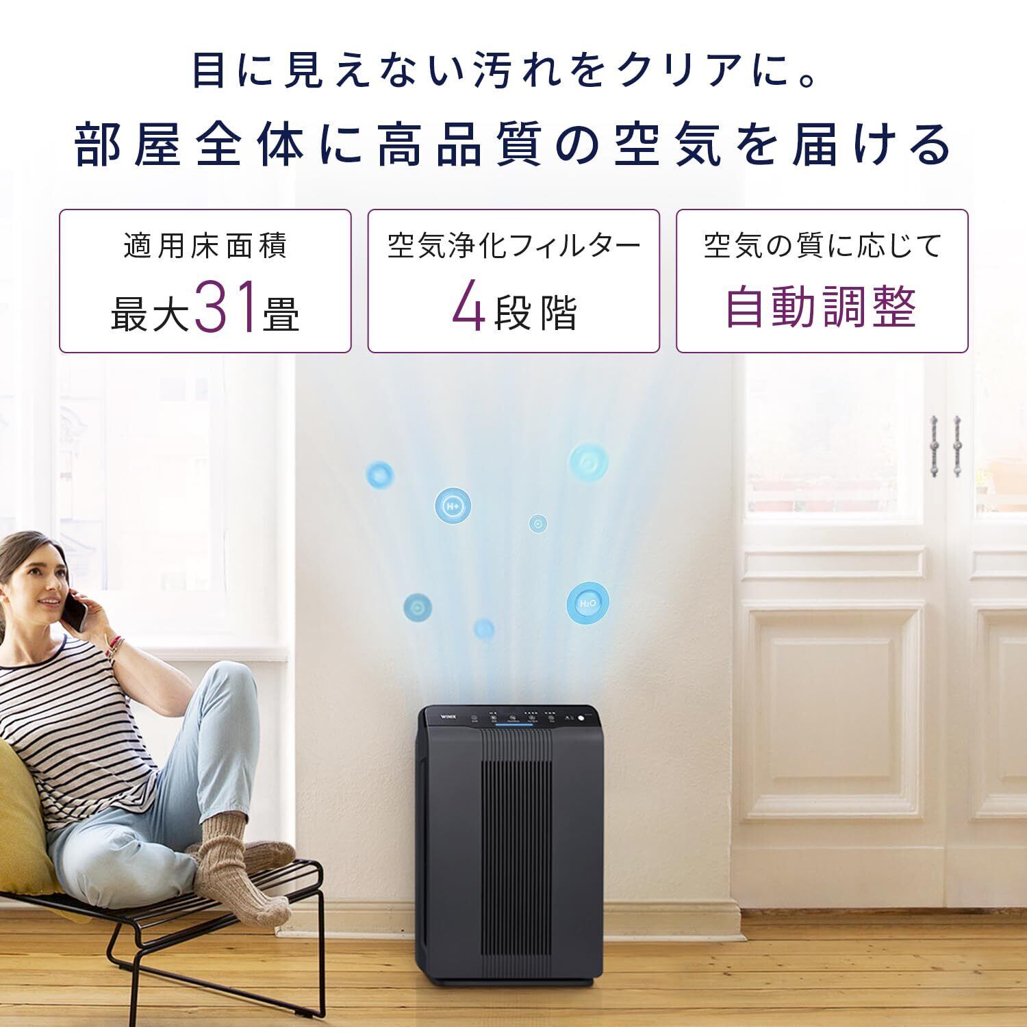 【空気の汚れに合わせて自動で最適運転】 センサーが室内の空気の質を常に検知し、自動で最適なファンの速度に調整します。空気の質がよければ低速に、普通なら中速に、悪ければ高速に切り替わるため、常に手間なく快適な空気環境を保てます。