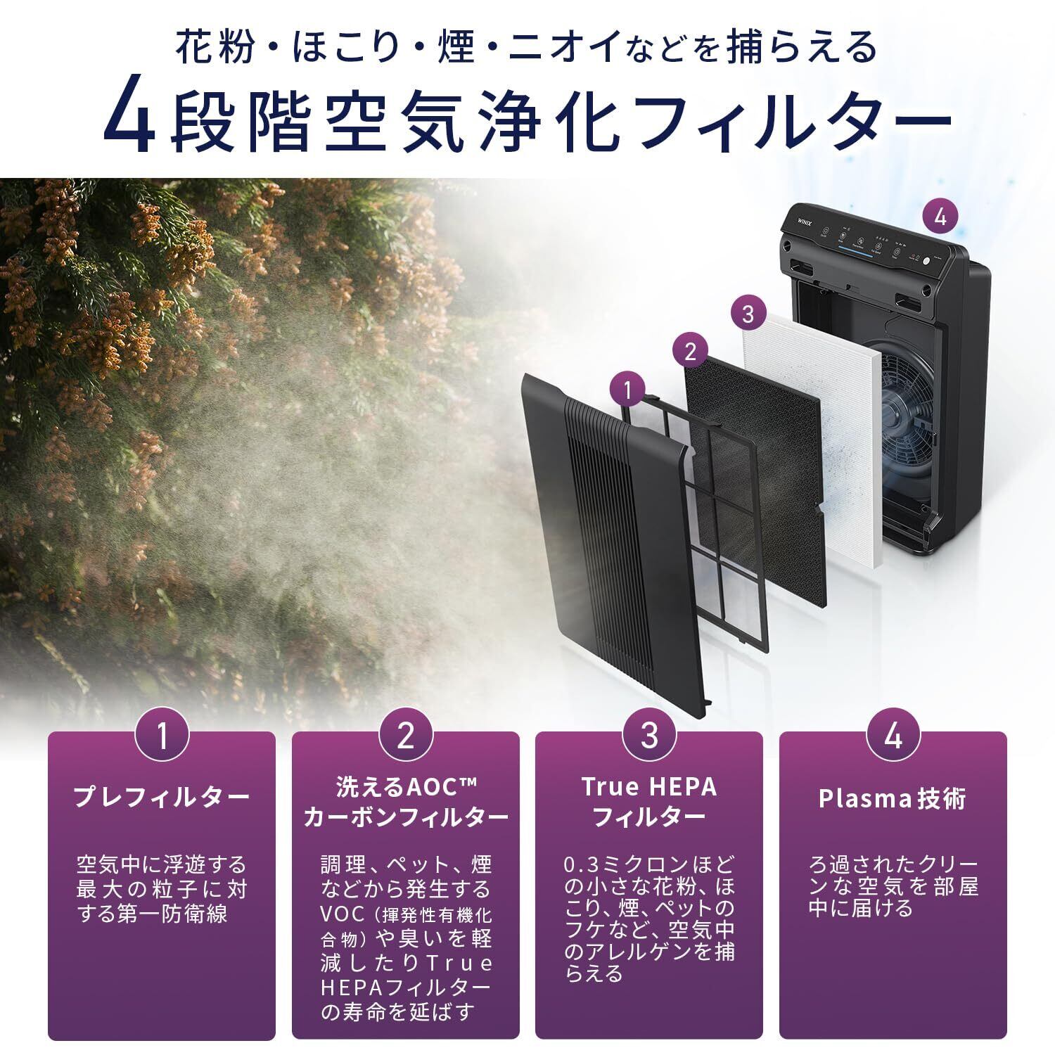【4段階のフィルターで空気を徹底的に浄化】 微細なホコリを捕らえる微細メッシュプレフィルターから、花粉やPM2.5を除去するTrue HEPAフィルター、気になるニオイを吸着する活性炭フィルター、さらにウイルスや細菌を抑制し、空気中の不純物を効果的に取り除きます。※空気の浄化とは、無生物の粒子を除去することを意味します。