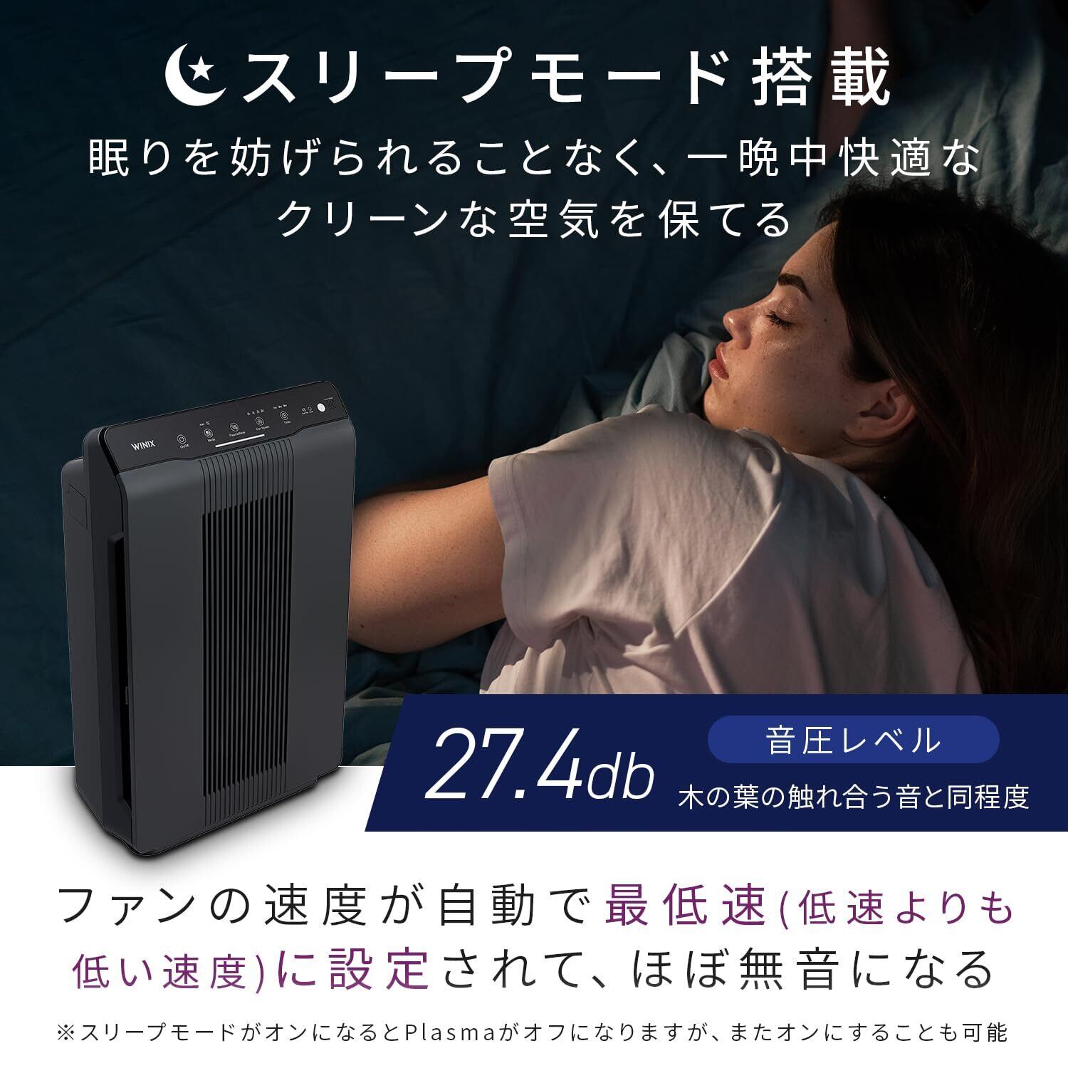 【静かで快適な睡眠をサポートするスリープモード】 就寝時に便利なスリープモードを搭載。ファンがほぼ無音の最低速運転になり、LEDランプも消灯するため、運転音が気にならず、安眠を妨げません。