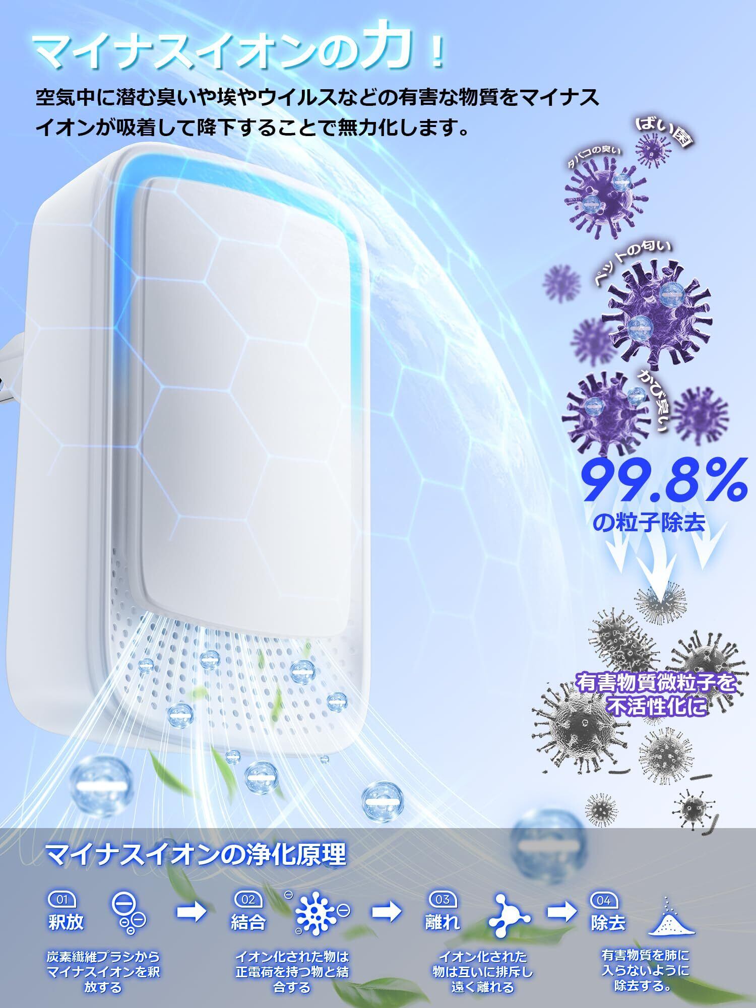 高濃度マイナスイオン発生、 マイナスイオン脱臭機、小型空気清浄機、約1億高濃度の清浄原理で空気中にある目に見えない、鼻にニオイするかしないことが肺に有害な浮遊粒子物質などを害の根本から分子破壊と分解可能です。マイナスイオン空気清浄機は、空気中にマイナスイオン(負イオン)を放出することによって、空気中の汚れを除去し、空気を浄化する装置です。また、負イオンは無色無臭であり、どうかご安心ください。