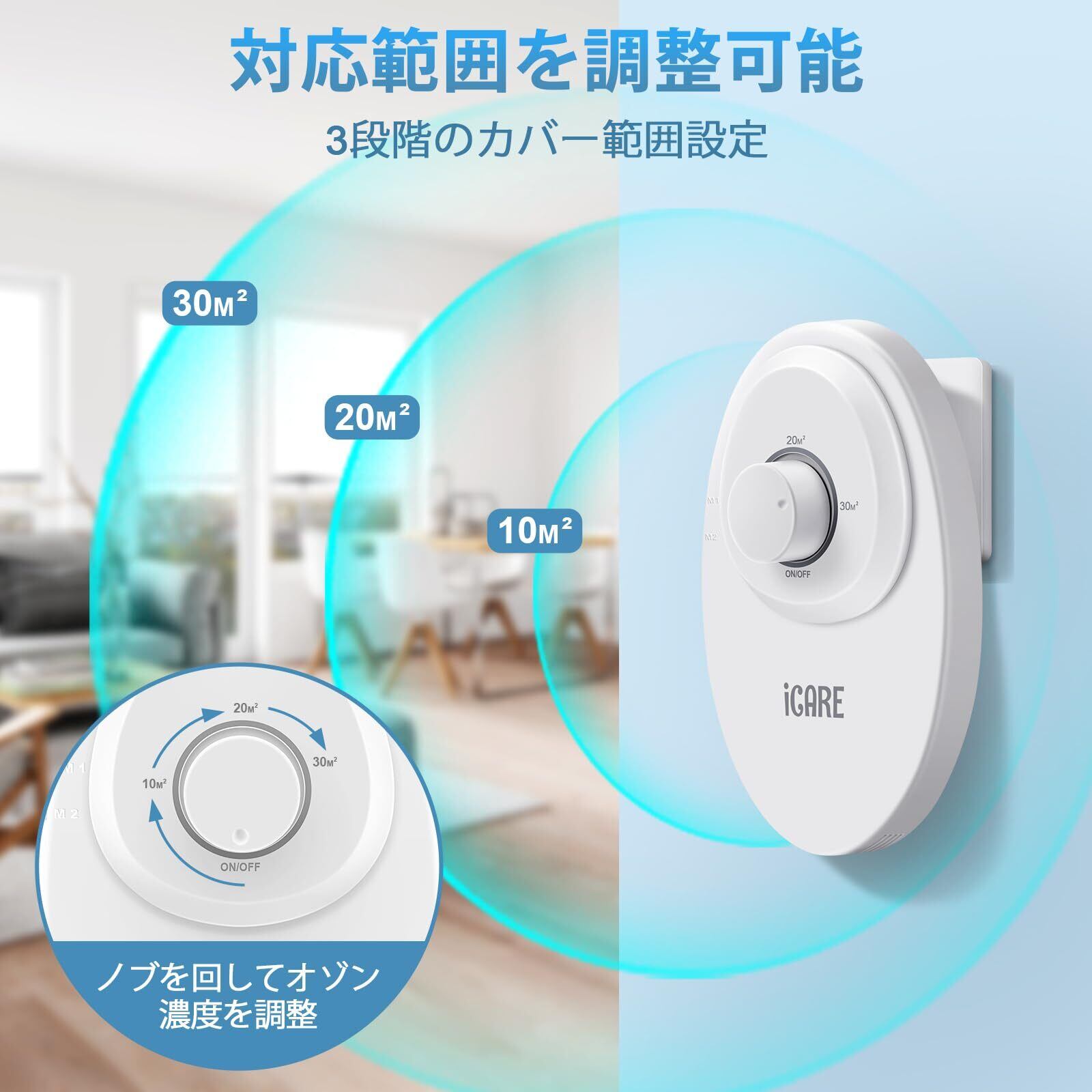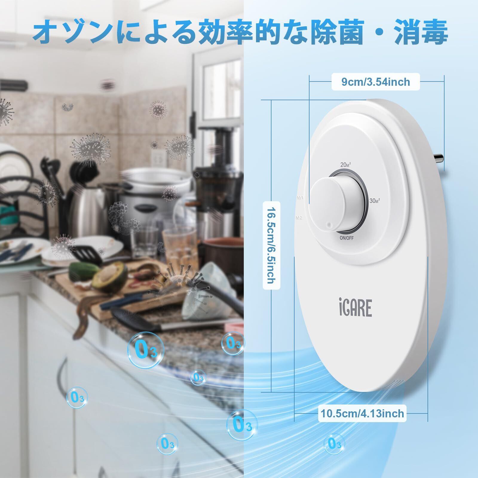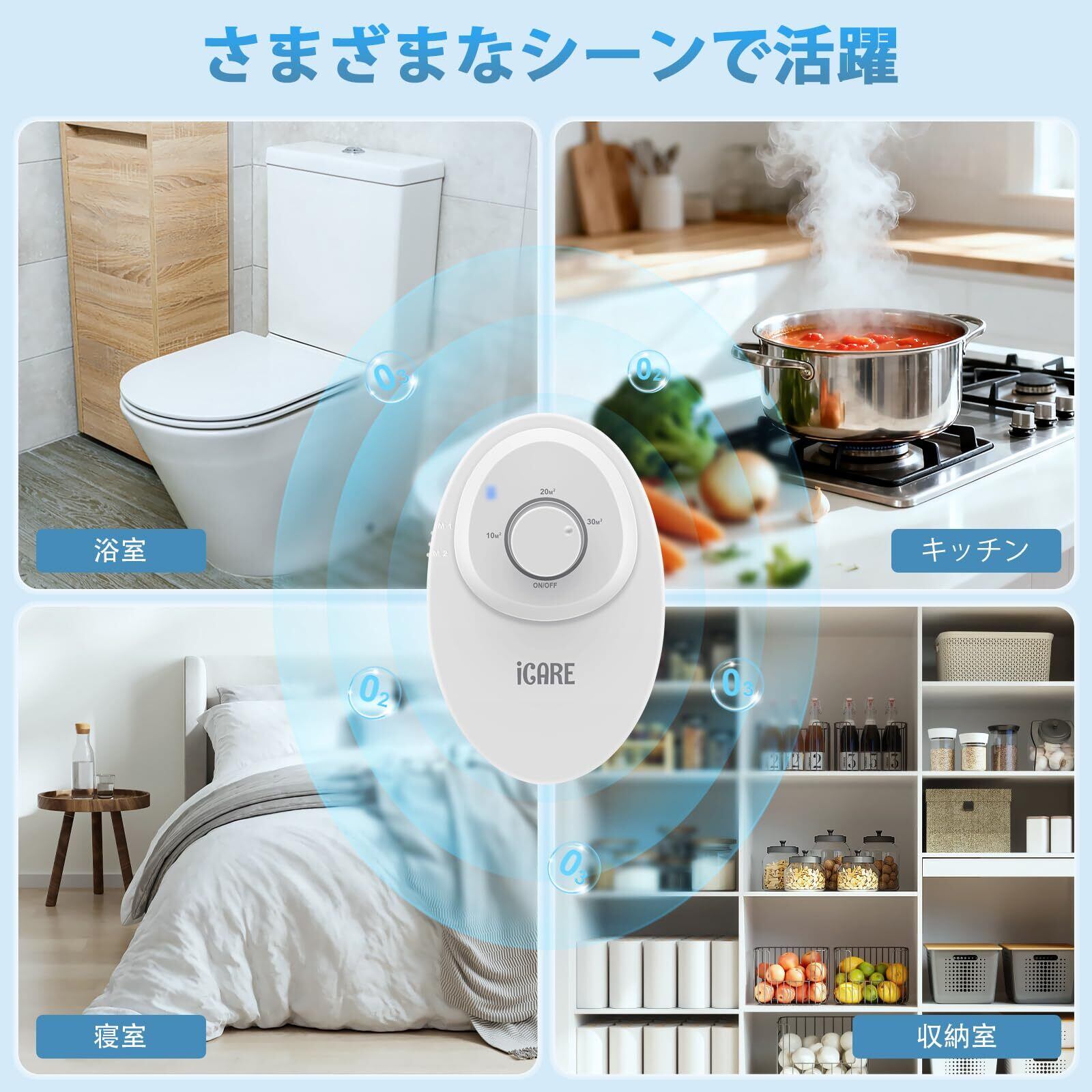 ICARE オゾン脱臭機:毎時120mgの低濃度オゾンを発生し、調理中の煙やペット臭やタバコなどの強いニオイを効果的に除去します。空気をリフレッシュし、不快な臭いを軽減することで、新築・リフォーム後の空気清浄や、日常的なニオイ対策、より清潔で快適な生活空間づくりに最適です。