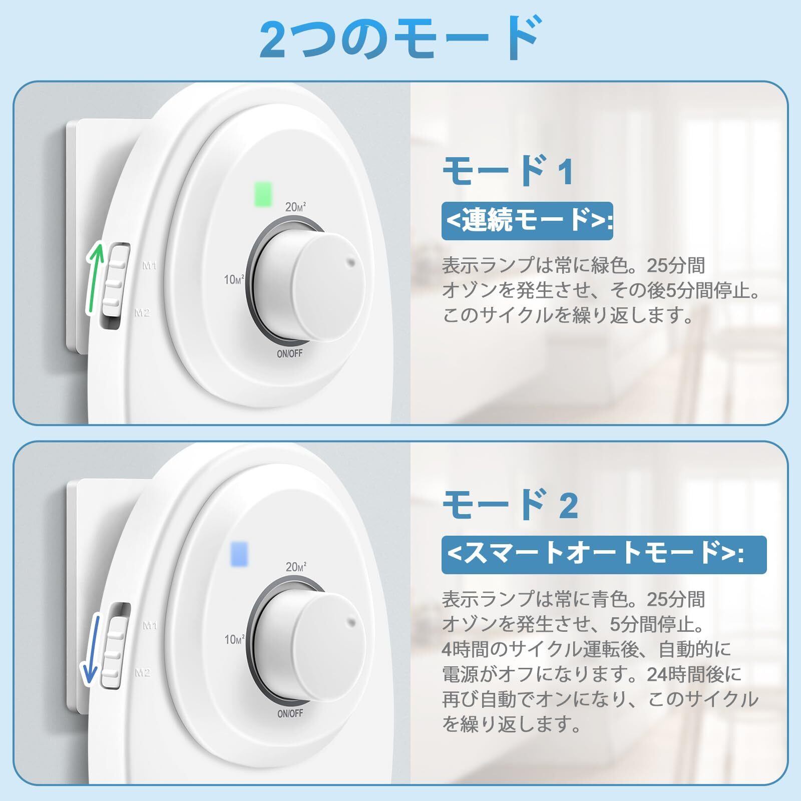 2つの運転モード搭載オゾン発生器:モード1(標準モード):緑色ランプが点灯。25分間オゾンを発生させ、5分間停止するサイクルを連続的に繰り返します。 モード2(スマート自動モード):青色ランプが点灯。25分稼働、5分停止のサイクルを4時間繰り返した後、自動的に電源がオフになります。24時間後に同じサイクルで再起動します。