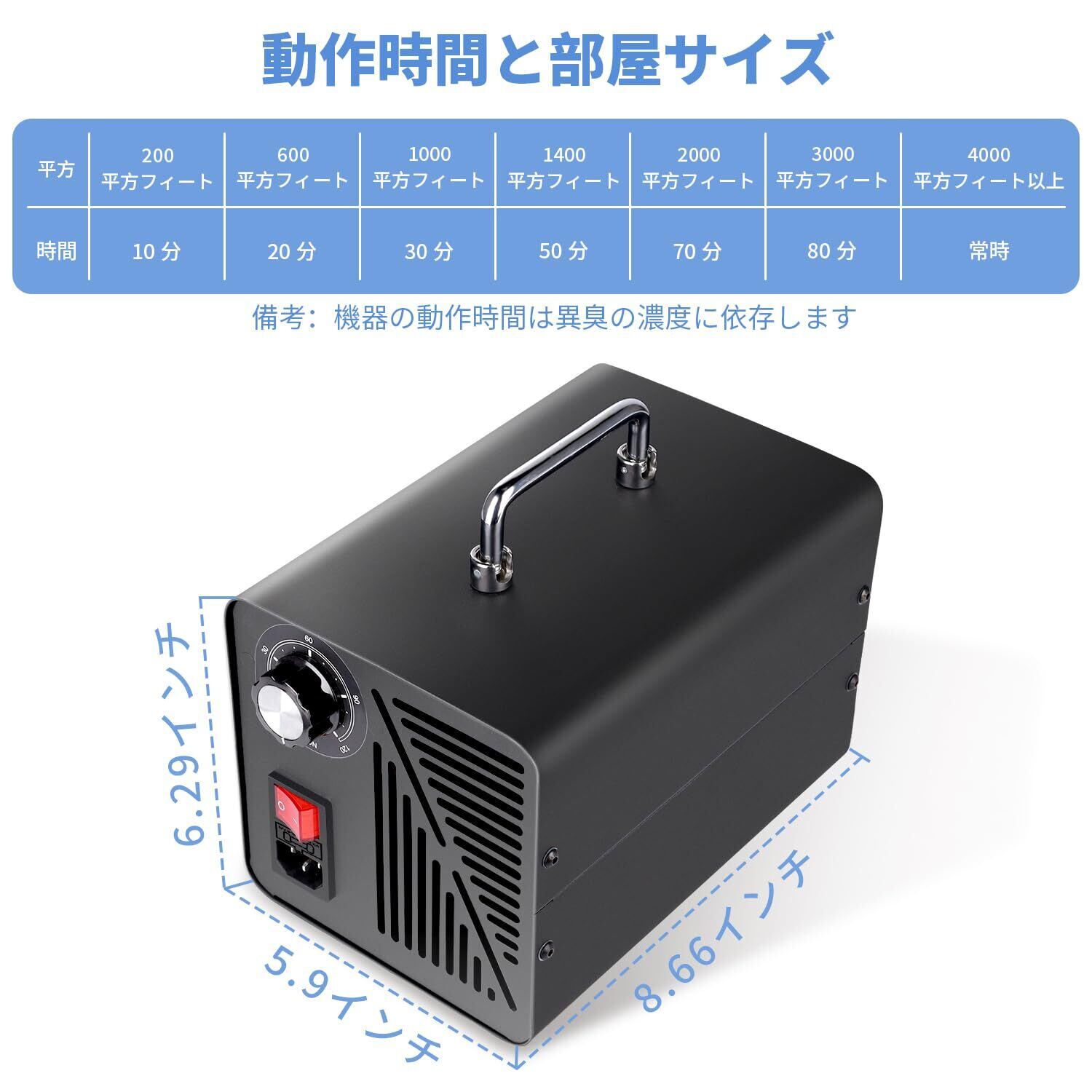 【60000mg/h発生量】大容量オゾンを素早く発生し、脱臭に必要なオゾン濃度を提供します。約300平方メートル脱臭力を持ち、公共施設、 ホテルや事務所や学校など、広い分野で活躍し、ペットカフェでも気兼ねなく使っていただけます。