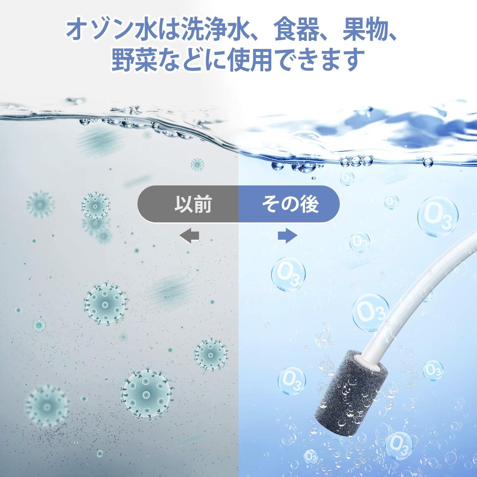 高オゾン生成能力:このオゾン水生成器は1000mg/hのオゾンを安定かつ静かに出力し、高濃度オゾンを迅速に生成して、浄化タスクを高効率で完了します