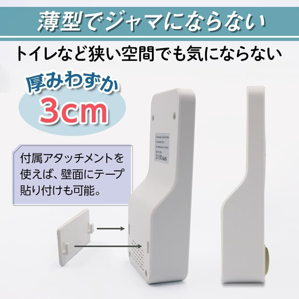 【設置しやすい】電源から1m離れた場所まで設置できる長い電源コード。トイレなど狭い空間でも気にならない、厚みわずか3cm。壁面貼り付けも可能。