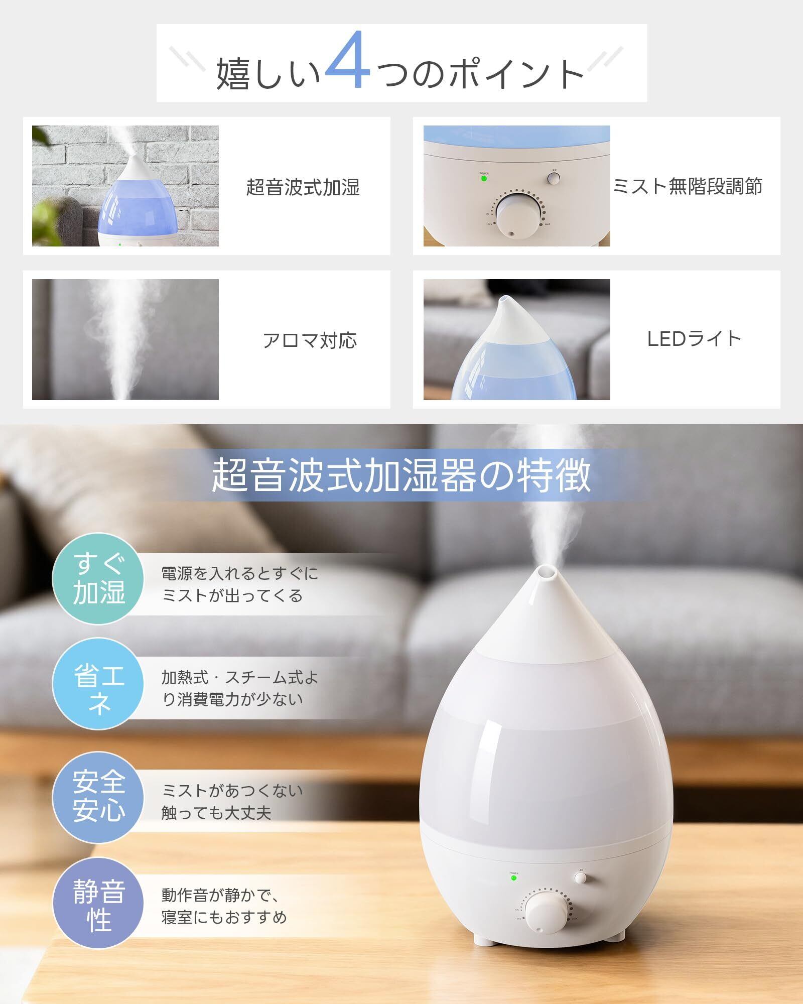 加湿器 小型 卓上 超音波式加湿機 アロマ対応 LEDライト お手入れしやすい 静音 省エネ コンパクト 空焚き防止 乾燥防止 肌荒れ対策 花粉症対策 家庭/寝室/美容院/オフィス/リビング/学校用 5-10畳 PSE認証済 日本語説明書付き 冬向け