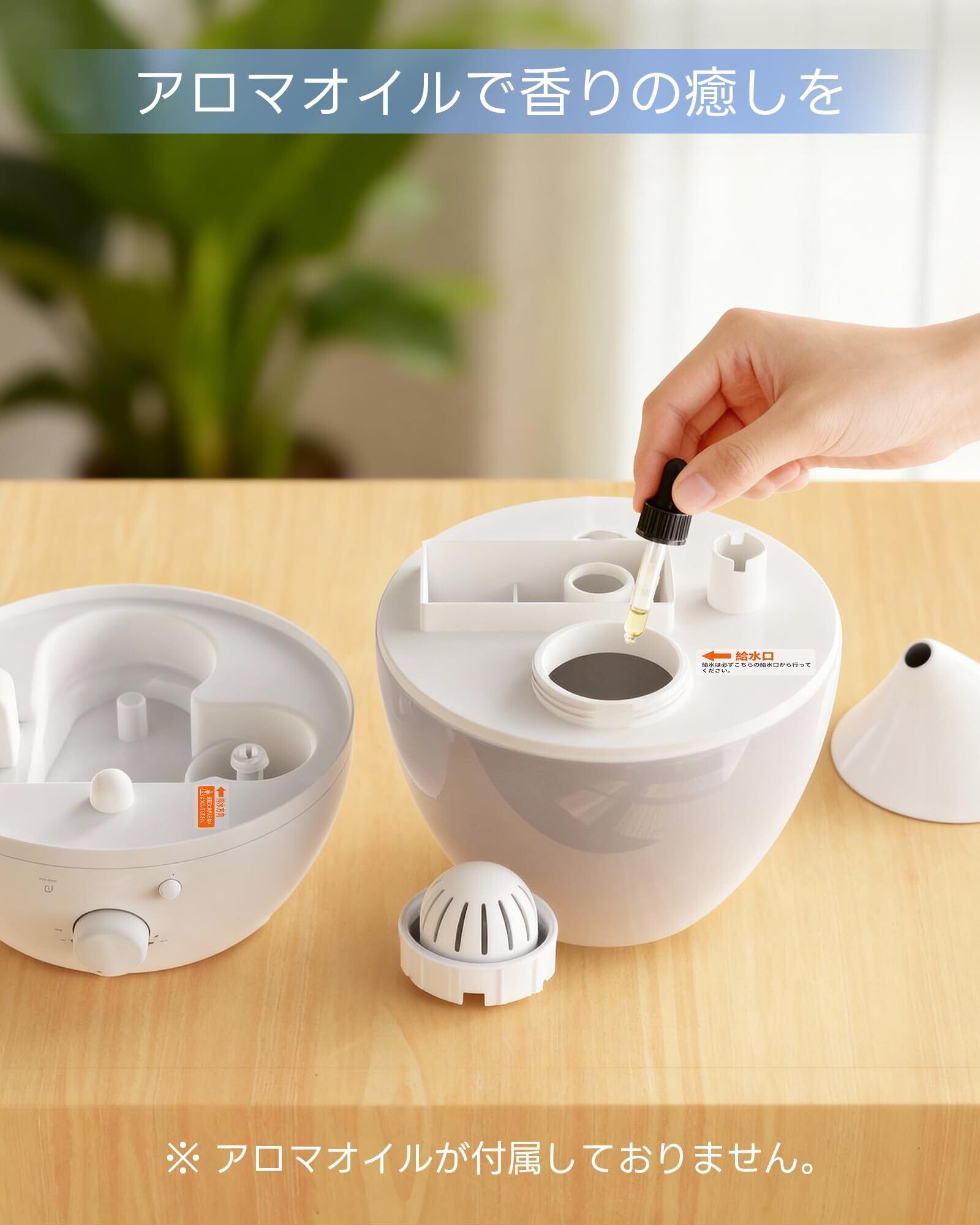 【アロマ対応・静音・省エネ】この加湿器は、乾燥から肌を守る加湿機能に加え、お好みのアロマオイルを使用できる精油機能を搭載されます。心地よい香りがリラックス効果をもたらし、質の高い睡眠をサポートします。さらに、加湿器は省エネルギー設計で電気代を気にせずご利用いただけ、静かな運転音で就寝中も快適します。加湿と芳香で心と体を癒し、日々の健康習慣を優しく支えます。
