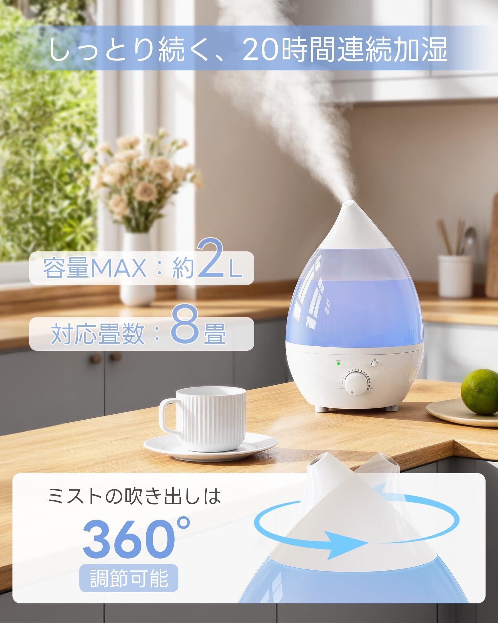 【超強ミスト加湿力】この超音波式加湿器は、微細なミストを素早く発生させることで、≤250ml/hの強力な加湿を実現できます。お部屋全体の乾燥を防ぎ、肌や喉のうるおいを守ります。加湿器は大容量タンクで連続使用が可能で、頻繁な給水の手間がいらず、28dBの極静音設計により、就寝時や仕事中の集中を妨げません。加湿器は360°自由調整できる吹き出し口で、ミストの方向を思いのままにコントロール可能です。5畳から10畳までの空間に最適で、一人暮らしの部屋でも家族のリビングでも、快適な湿度環境をお届けします。