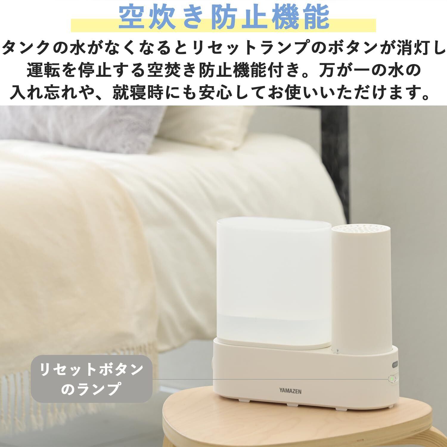 【空炊き防止機能】水タンクの水がなくなるとリセットボタンのランプが消灯し自動で電源OFFになる空焚き防止機能付き。万が一水を入れ忘れた際にも安心です。