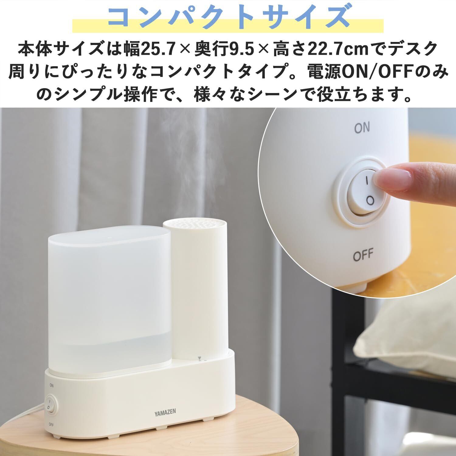 【商品仕様】▪本体サイズ:幅25.7×奥行9.5×高さ22.7cm ▪本体重量:700g ▪水タンク容量:1.5L ▪適用床面積:木造和室~約2畳/プレハブ洋室~約3畳(MAX運転時) ▪電源:交流100V(50/60Hz) ▪消費電力:130W ▪加湿量:150ml/h ▪連続運転時間:10時間 ▪電源コードの長さ:1.6m ▪期間:お買い上げ日より間(の範囲については、書をご確認ください。(一般家庭用以外(業務用など)に使用された場合の故障及び損傷などは対象外となります))