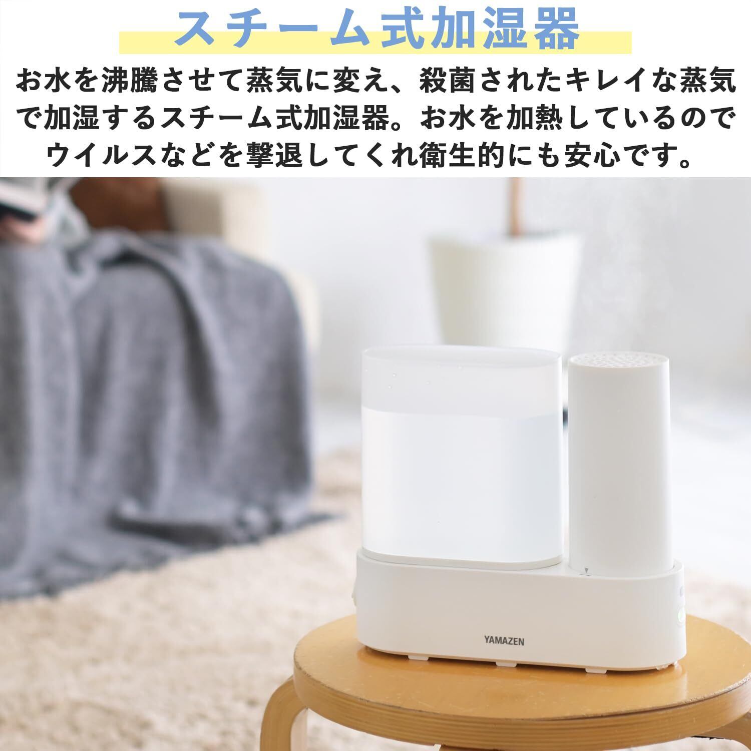 【加熱式加湿器】お水を沸騰させて蒸気に変えて、殺菌されたキレイな蒸気で加湿する加熱式加湿器。お水を加熱しているので、ウイルスなどを撃退してくれ衛生的にも安心です。
