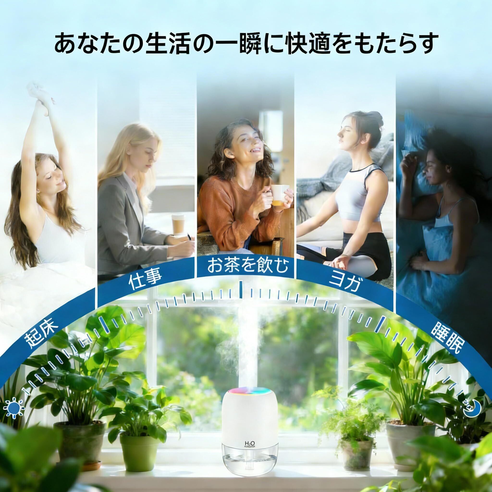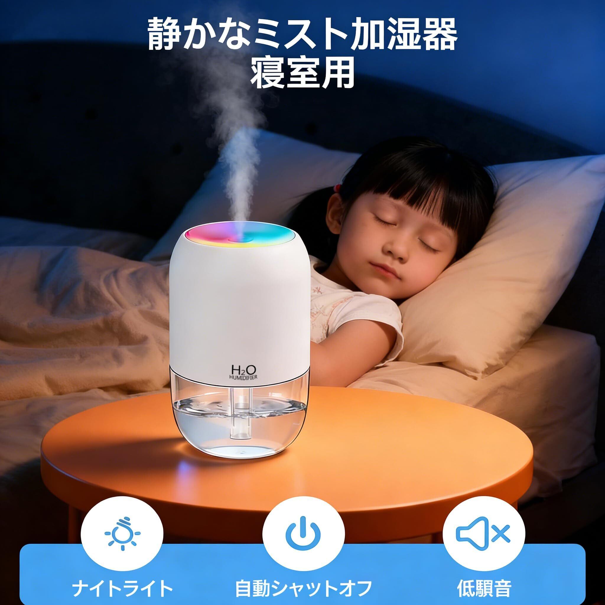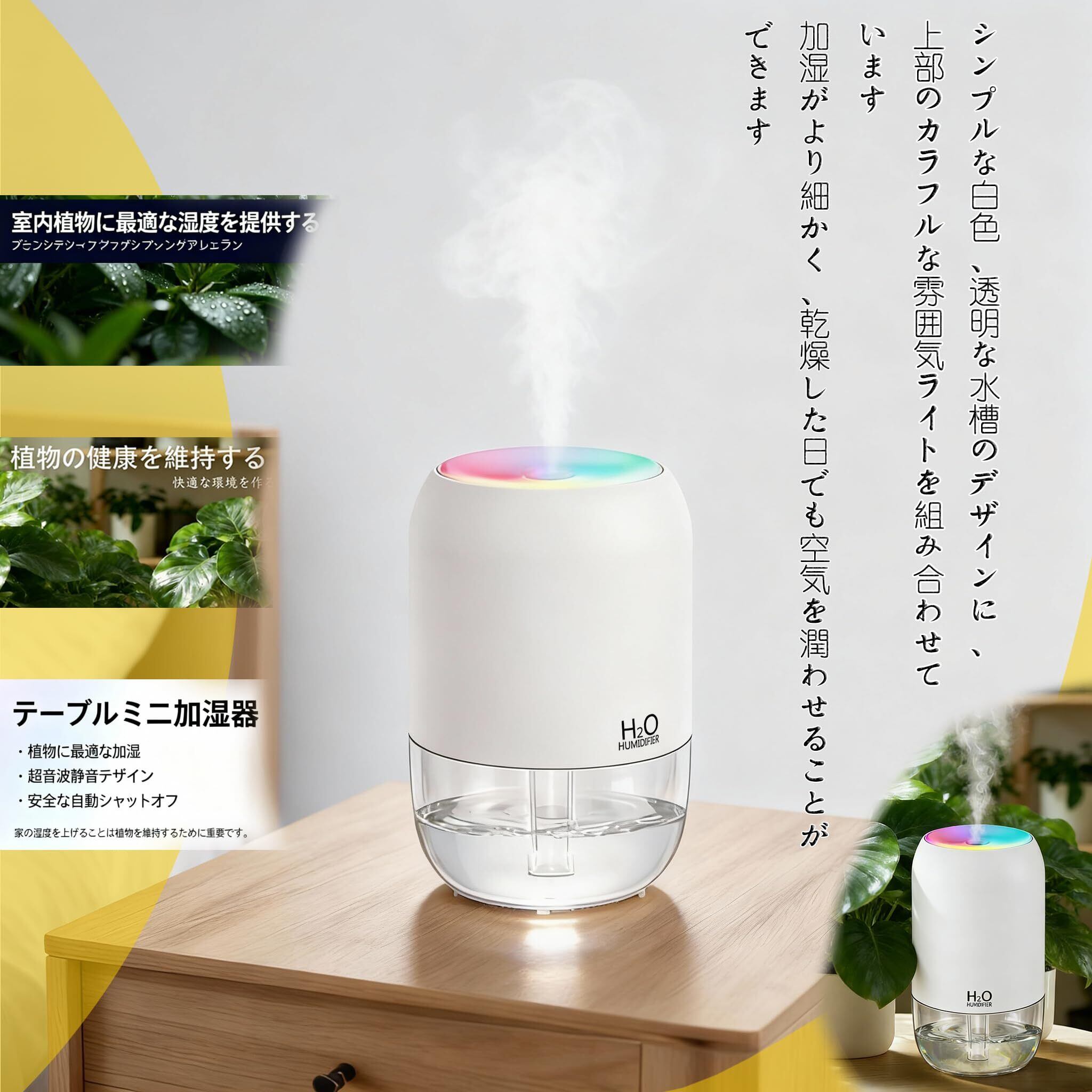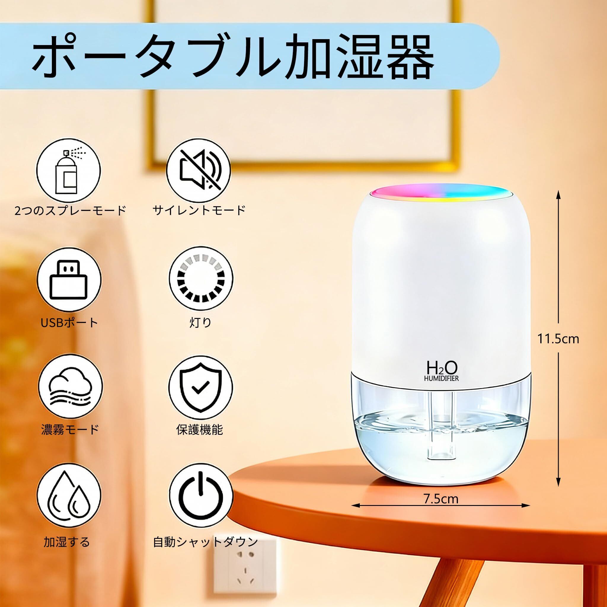 USB接続でしっかり加湿!目に見える霧が乾燥と闘う、コンパクト卓上加湿器 デスクや枕元のパーソナルスペースに、確かな潤いと優しい光を届けるUSB式超音波加湿器。パソコンに繋ぐだけで、目に見える霧が乾燥した空気を瞬時に変えます。 【製品の特長】 確かな加湿感:超音波振動で発生させる微細な霧(ミスト)は、乾燥したのどやお肌に直接アプローチ。加湿状態が目で確認できるので、効果が実感できます。 USB直接給電の便利さ:内蔵電池がないため、充電の手間が一切ありません。パソコンやテレビのUSBポート、市販のACアダプターに接続すれば、即座に連続運転が可能です。 光と霧の癒し空間:7色にゆっくりと変化するLEDライトが、ミストを優しく照らし、お部屋をリラックスムードに包み込みます。 どこでも静かなパートナー:図書館のような静音性を実現。オフィスでの集中作業、寝室での深い眠りを静かにサポートします。