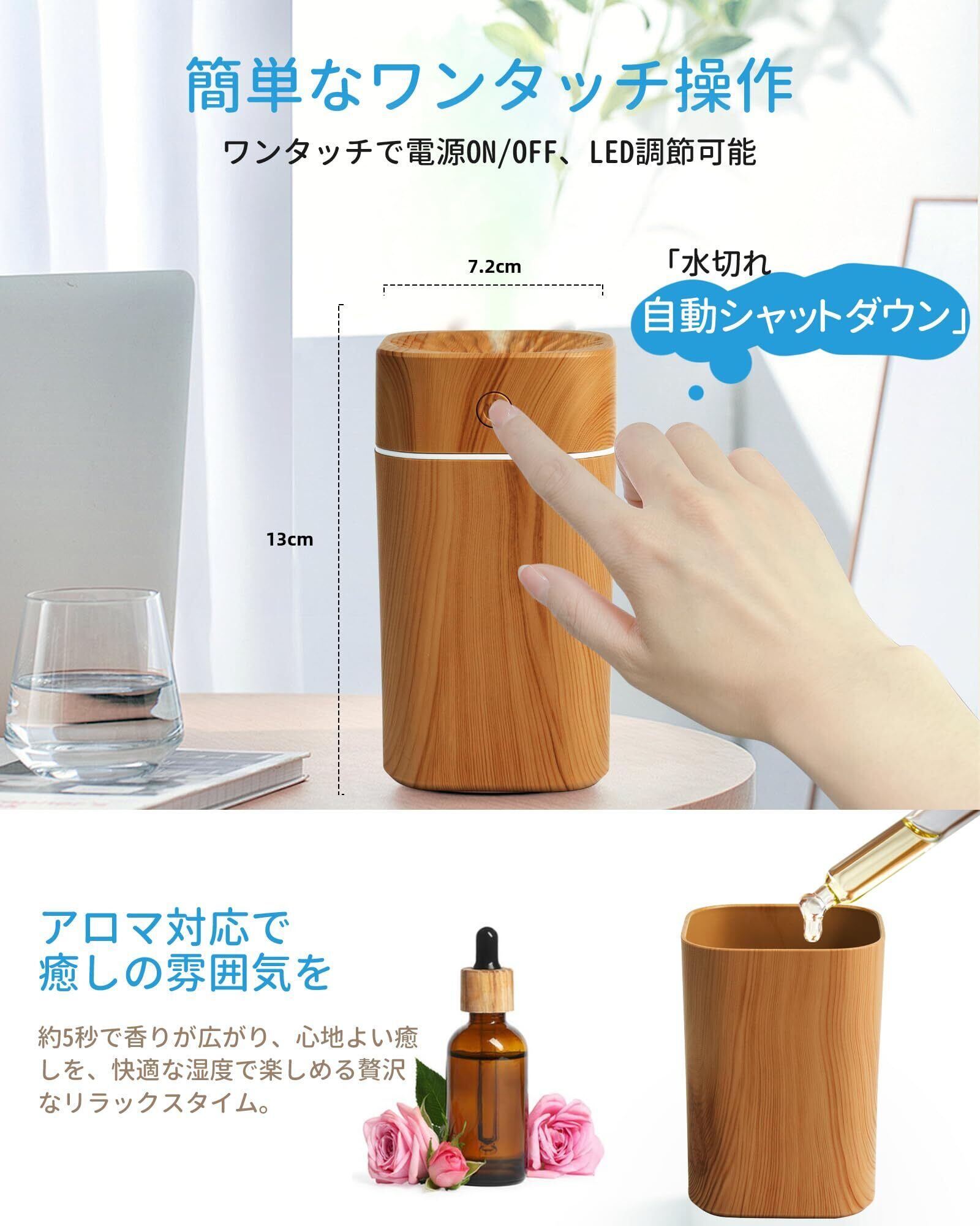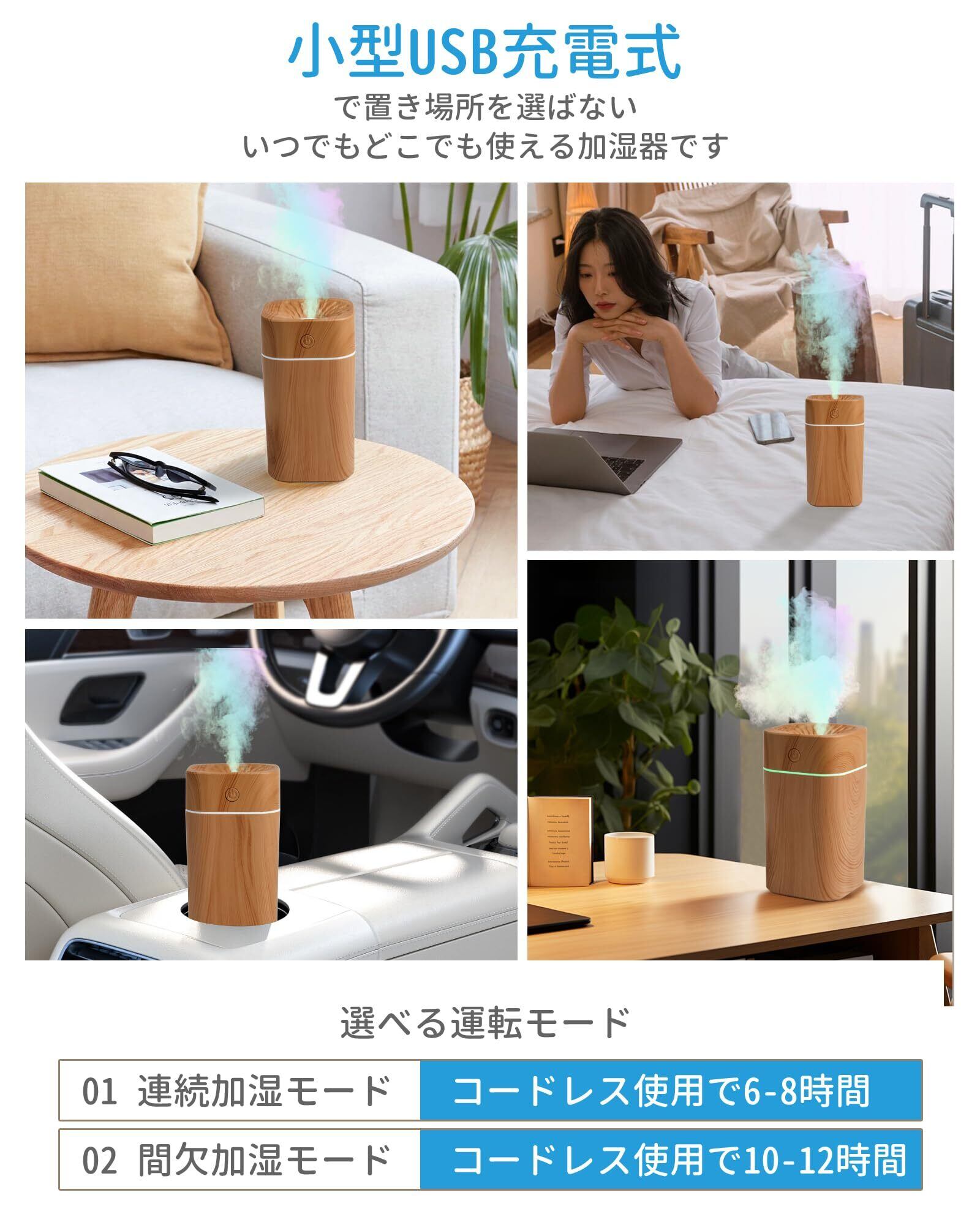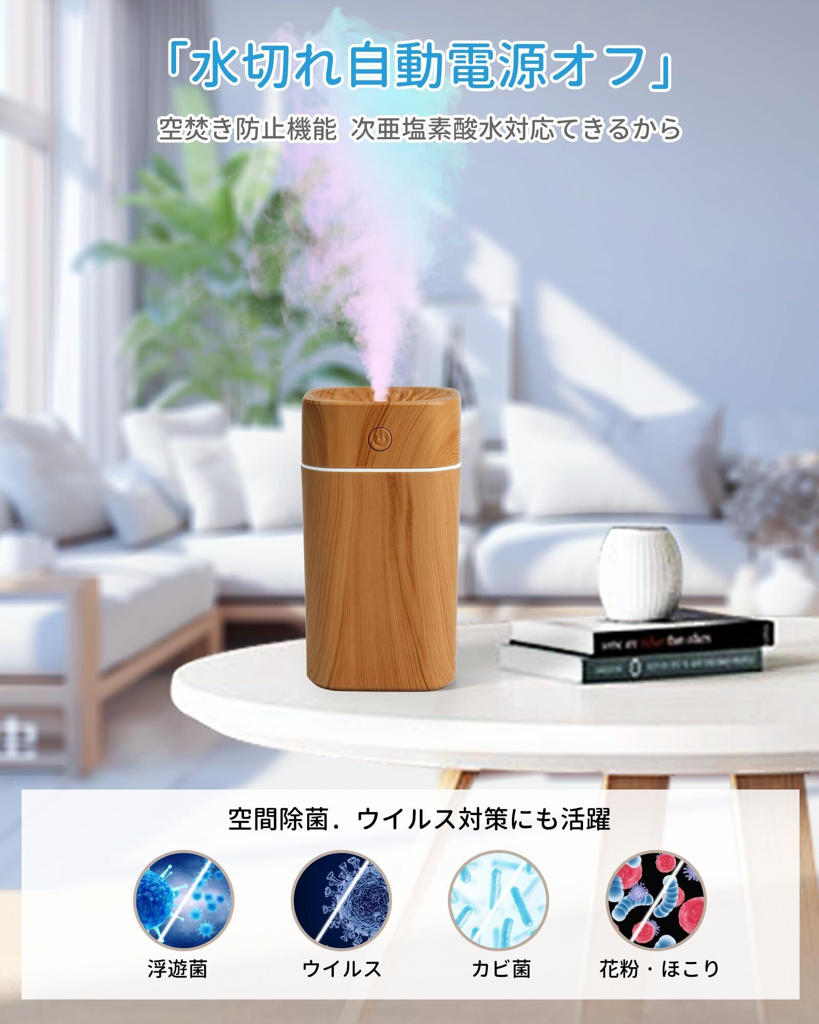 加湿器 卓上 小型 卓上加湿器 大容量 300ML 静音 除菌 超音波式 長時間連続稼働 コンパクト 7色LEDライト コードレス ミニ 空焚きを防止 濡れ防止 次亜塩素酸水対応 持ち運び便利 自動停止機能 乾燥/花粉症対策 オフィス/寝室/子供部屋/家庭用/車用 浅い木目色
