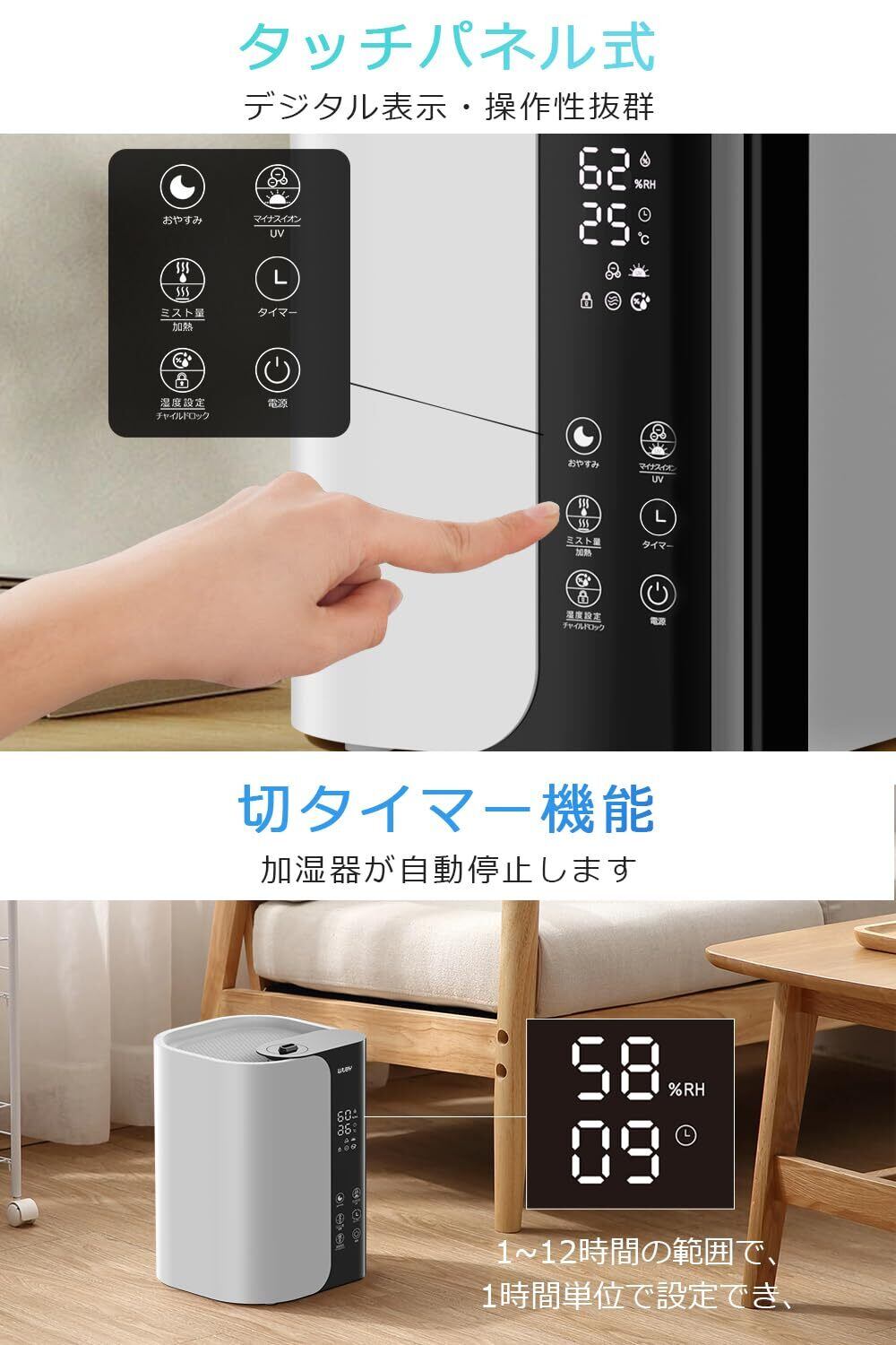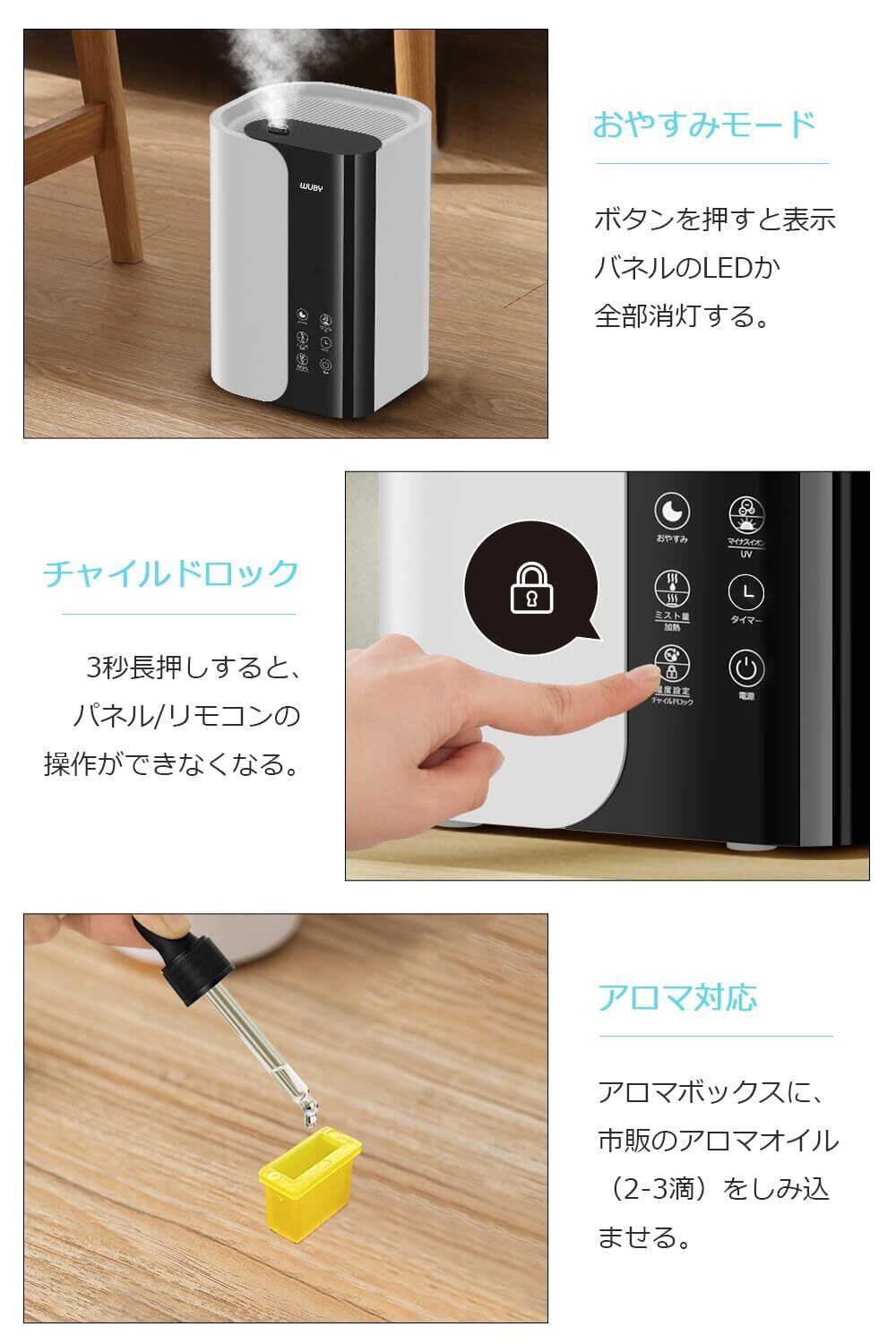 【6L大容量&6段階ミスト量調節&加熱式加湿器】6Lの大容量加湿器は、湿度を長時間保持します。加熱機能を選択すると、温かい霧が噴出され、より効果的な除菌が可能です。加湿量調節には合計6つの段階があり、加熱しない場合は3つの段階と加熱時の3つの段階があります。さらに、 加湿器 アロマ対応 !アロマトレイが内蔵され、好みなアロマオイルを垂らし、潤いとともに癒しの香りもお届けします。