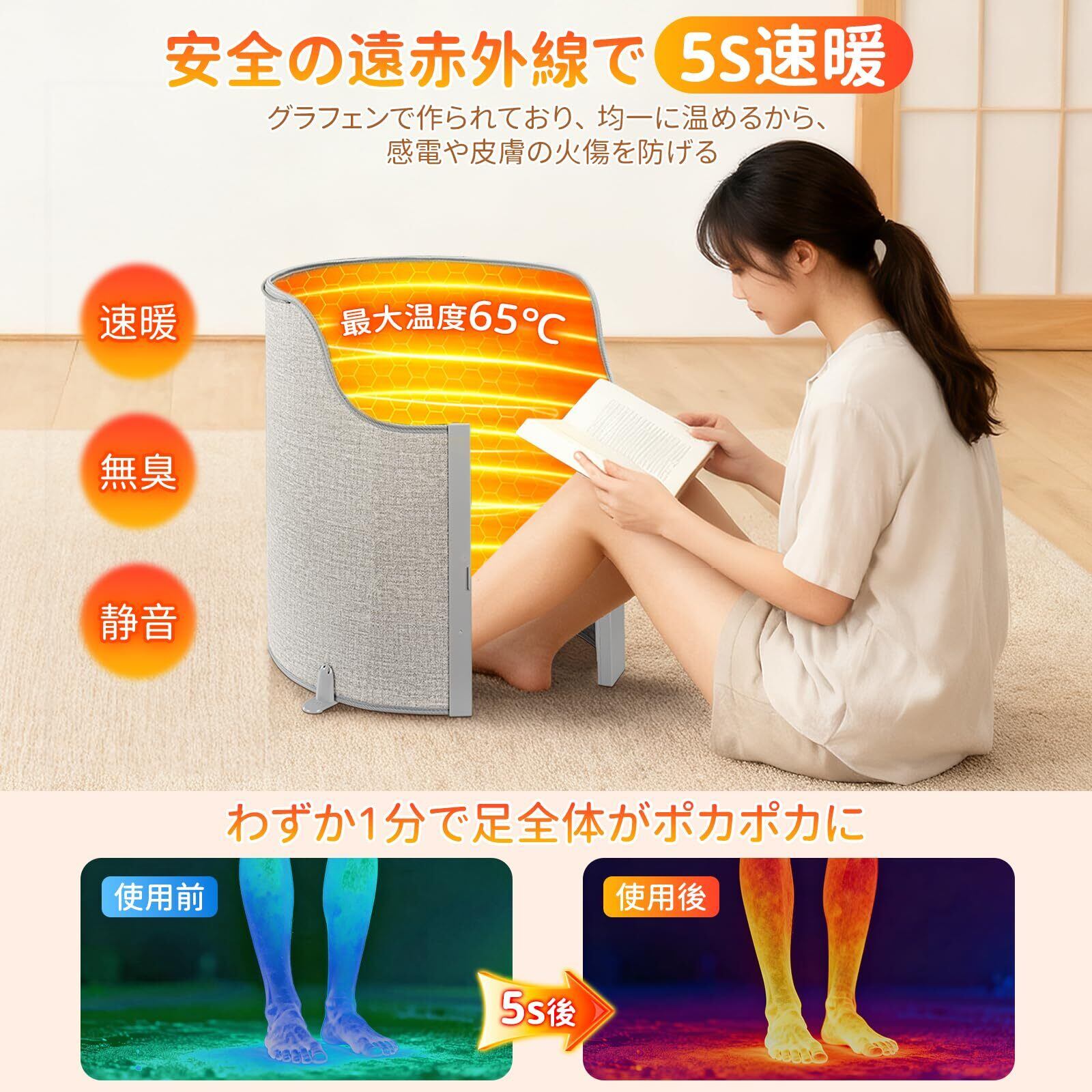【驚きの速暖性と省エネ性能!】スイッチを入れてから約5秒で暖かさを実感できる即暖仕様の足元ヒーターです。カーボン結晶加熱方式を採用しており、安定した高速加熱と均一な加熱が可能です。節電しながら継続的な暖かさも得られます。温風を使わずに遠赤外線で発熱するので室内の乾燥を防ぎ、空気を清潔に保ちます。とても良い冷え対策になります。1時間あたりの電気代は約2円と経済的で、セラミックヒーターや電気ファンヒーターの約1/6の消費電力です。足元ヒーターの電力は124W、低消費電力、より省エネです。