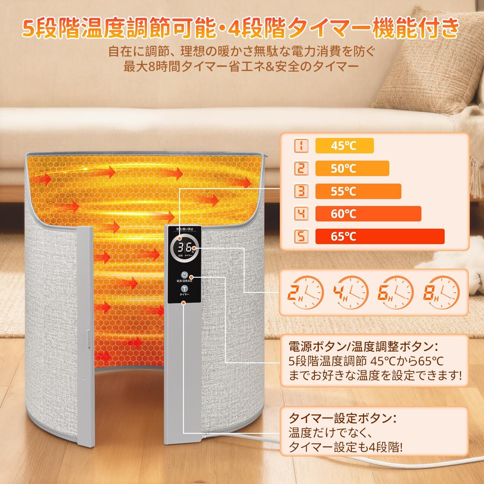 【5段階温度調整&4段階タイマー設定】このパネルヒーターは自由に調整できる5つの温度(45度/50度/55度/60度/65度)があります、室内の温度や体調によって適切な温度を選択することができます。また、家の中の子供やペットにも適しています、遠赤外線を通してヒーターは快適な温度を維持します。また、消し忘れを防ぐために、タイマー機能が付き、2H、4H、6H、8Hという4つの時間設定ができます。暖かさを提供するとともに、安全をより良く保護することができます。ニーズに応じて自由に調整できます。夜間使用でも安心して眠れます。