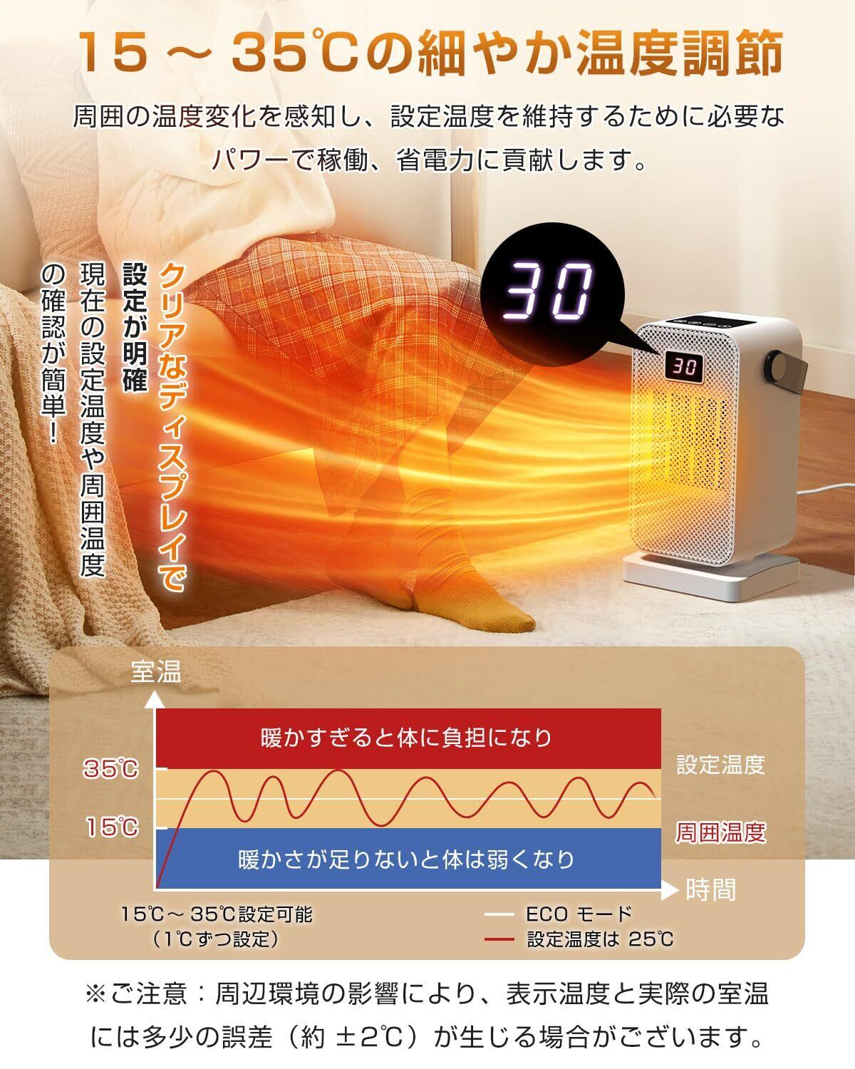 【ディスプレイ画面表示&35℃まで温度調整&静音設計】当電気ヒーターは、15℃~35℃まで1℃単位で細かく温度調整が可能です。お部屋の状況やお好みに合わせて、最適な暖かさを簡単に設定できます。デジタル温度表示が付いているので、現在の室温が一目でわかり、寒い日には少し高めに設定し、暖かい日には低めに調整するなど、季節の変化に対応。静音設計で運転中の音が非常に小さく、就寝時や読書、テレビ視聴中でもほとんど気になりません。ベッドルームやオフィス、図書館など、静けさが求められる場所で大活躍!