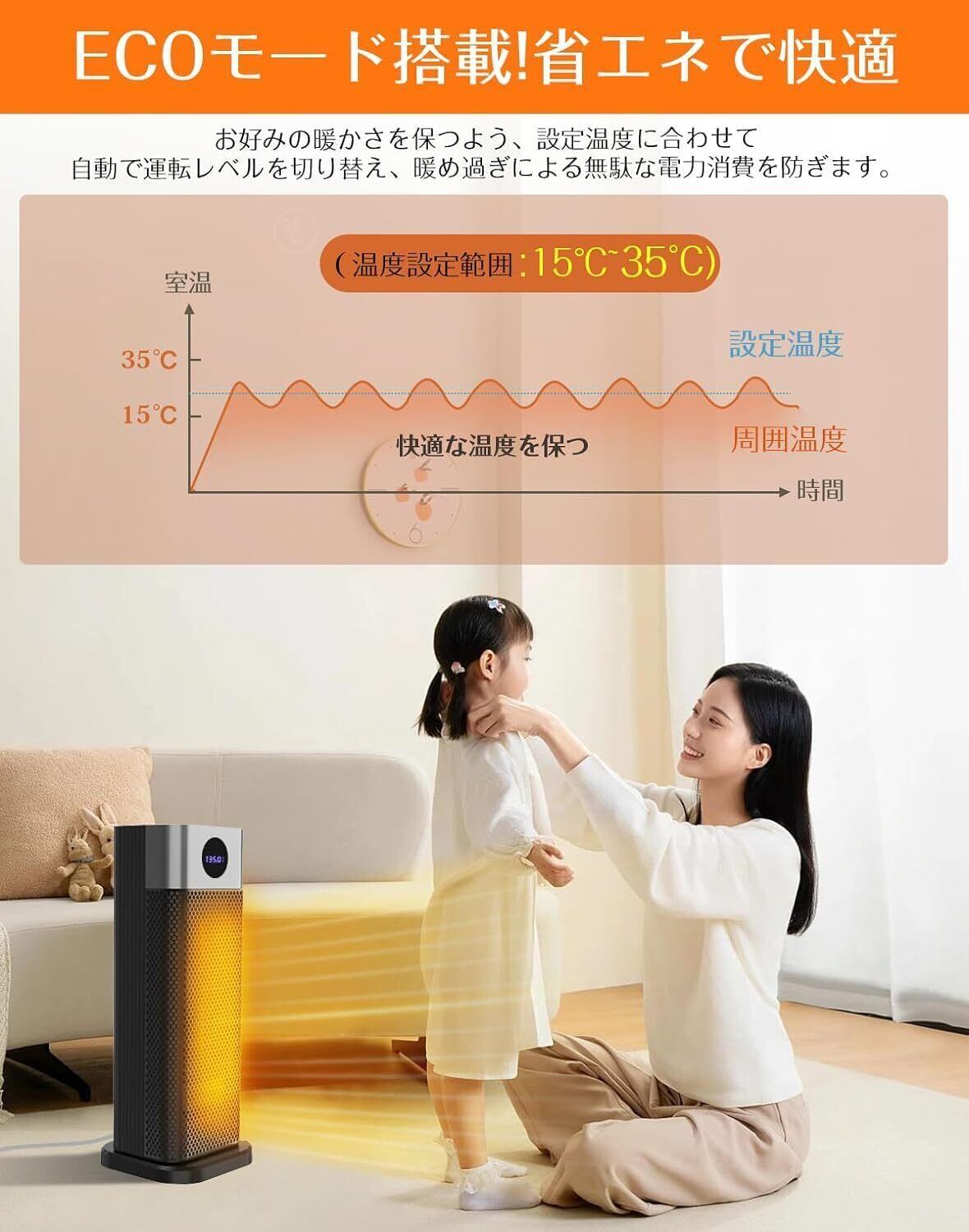特徴 タイマー&切り忘れ防止機能, 即暖&温風切り替え, 省エネ・室温センサー付, 転倒オフ機能&過熱防止機能, 首振り