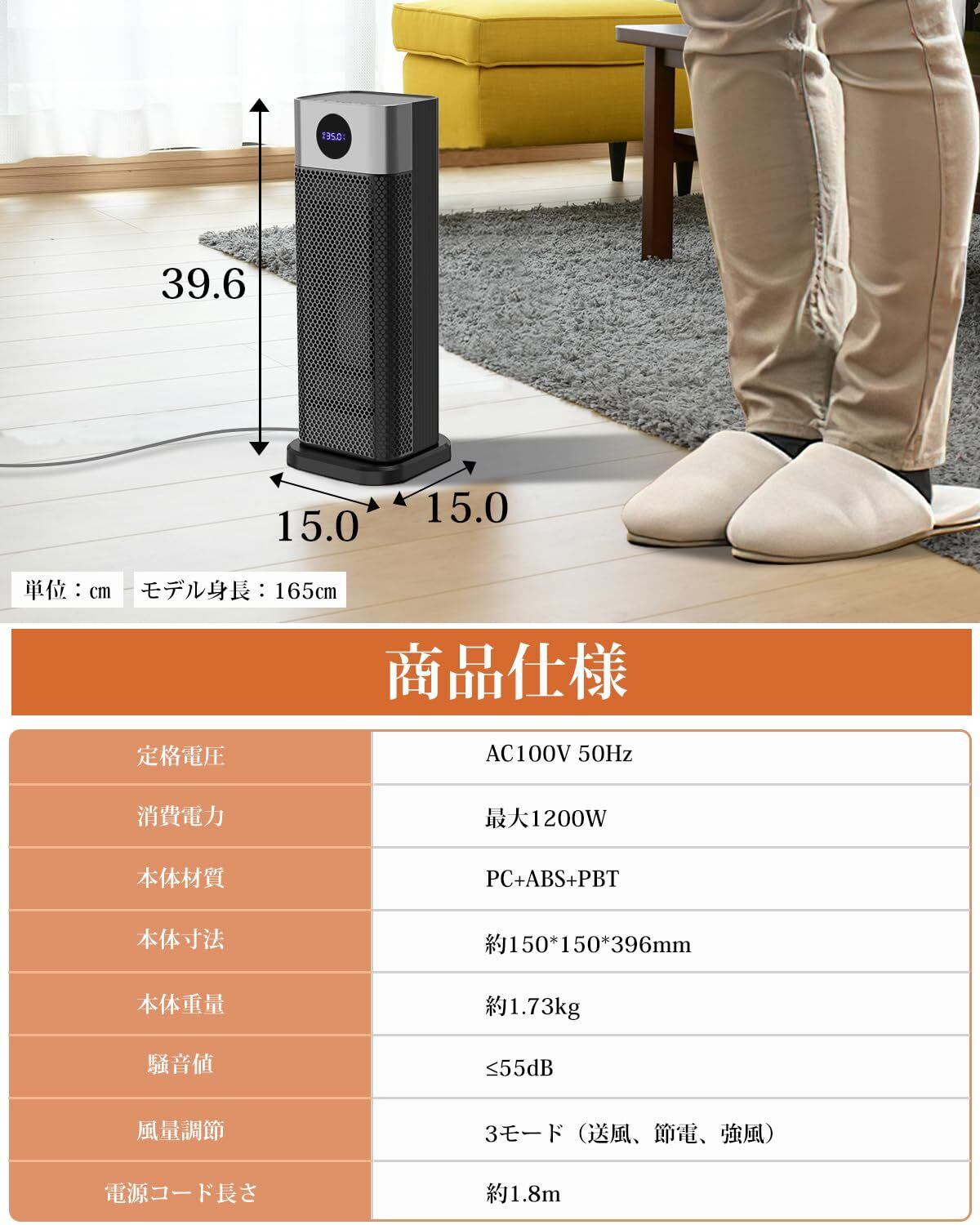 【充実のアフターサービス】本体サイズ:幅15×奥行15×高さ39.6cm、本体重量:1.73kg、電源:AC100V 50/60Hz、電源コード長さ:約1.8m,消費電力:最大1200W、出力3段階:(送風8W/弱温風800W/強温風1200W、※出力ワットだけ変わる、風量は変わらない。お届けから、ご購入後のアフターサービスまで、トータルでご満足頂けるように努めています。万が一初期不良などご満足頂けなかった場合、ご購入の販売元からメールにてお気軽にお問い合わせください。ご連絡の方法:「アカウントサービス」→「注文履歴」→「販売元」→「質問する」。