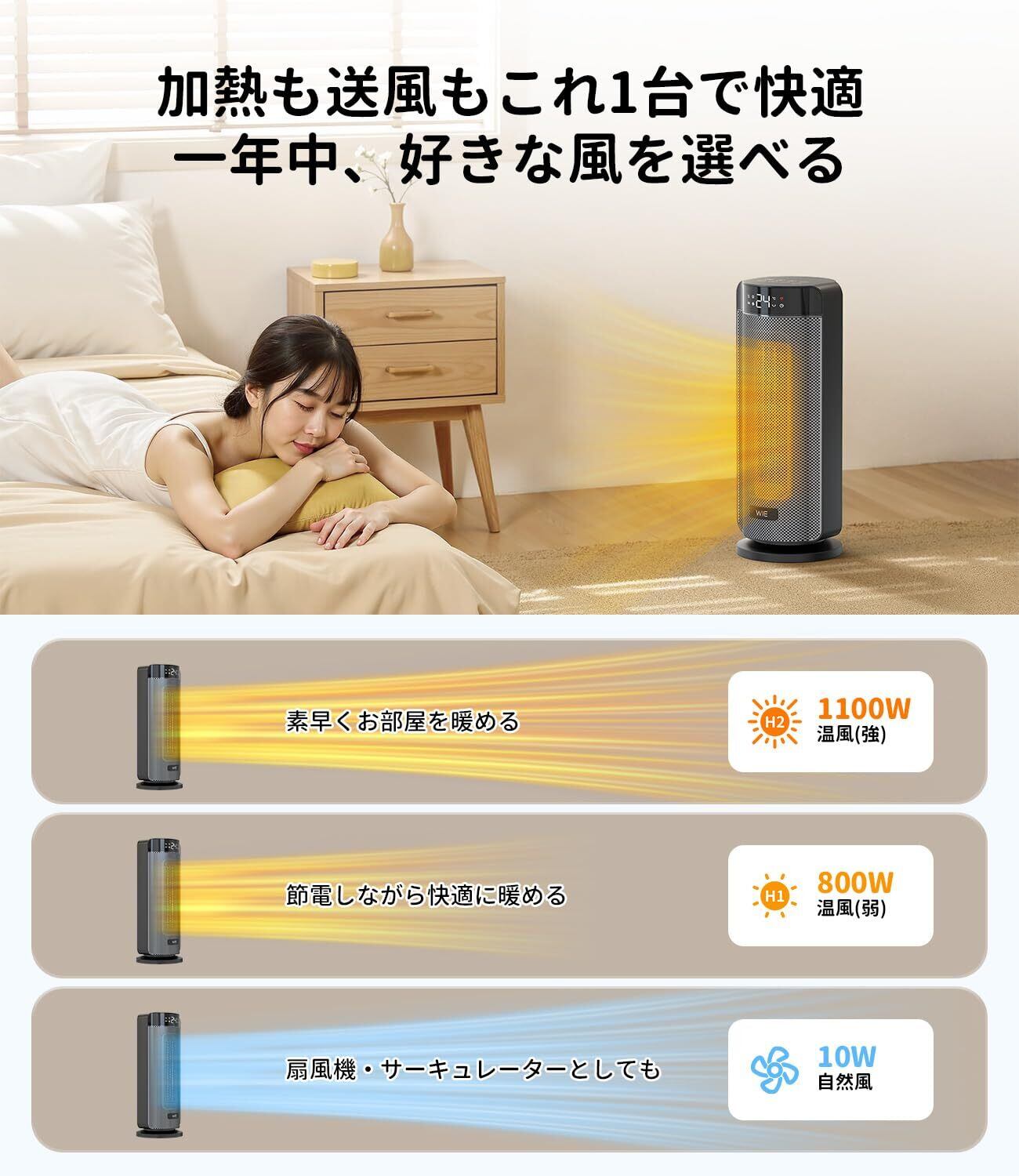 WIEセラミックファンヒーター約11畳対応 クロスフローファン 直進性温風 70°首振り 800W/1100W リモコン付き 3段階温度調整 タイマー 転倒OFF 過熱保護 軽量・取っ手付き 足元/脱衣所/寝室 電気ヒーター マットブラック