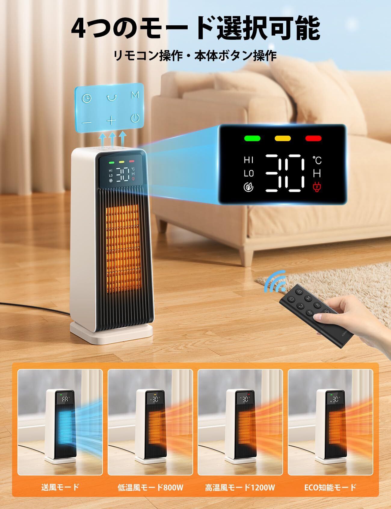 【ECOモード・省エネ性能・12時間タイマー】電気ストーブはECOモード(知能恒温機能)があります。温度センサー付きで、周囲の温度に応じて高低温風モード800W/1200Wに自動的に切り替えることができます。お好みの温度(25~30℃まで)設定が可能なので、快適な室温を保つことができます。暖めすぎによる無駄な電力消費を抑えるエコモードは省エネ機能で電気代の節約を実現。セラミックファンヒーターは便利な1-12時間切タイマー付きで、寝入るまでの間だけ使いたいときや、外出ときに便利!設定した時刻に自動でオフするタイプで、電気の無駄がなく、省エネ。環境にも財布にも優しい。かつ、電源が切れていない場合、前回使用時の運転モードと首振りを記憶する機能が搭載され、また使用するときには再設置する必要なくなります。