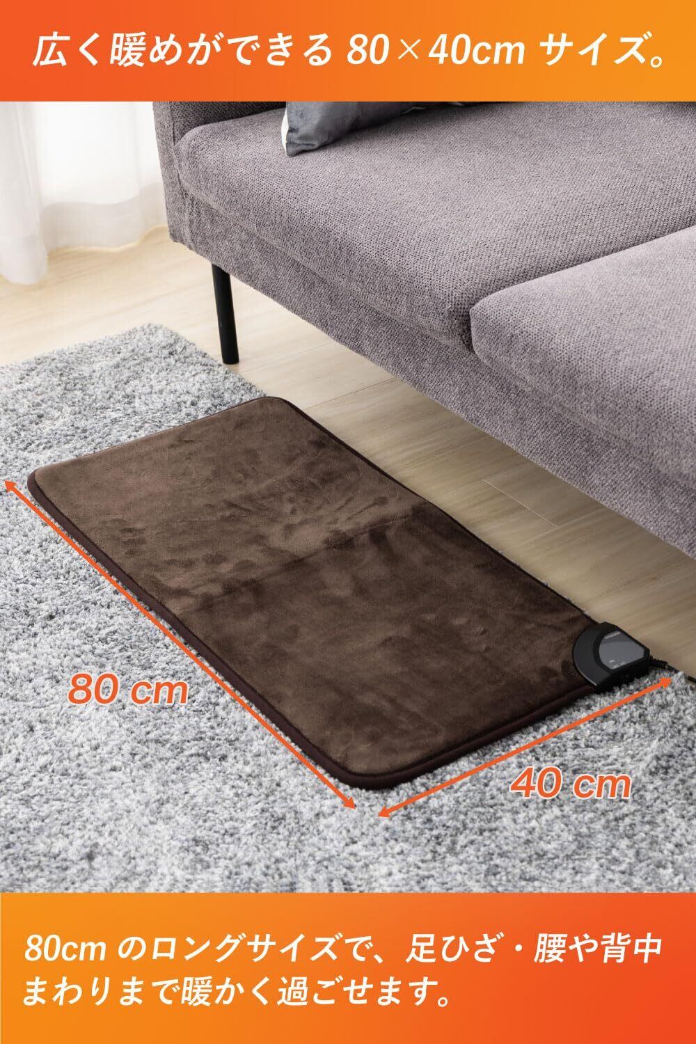 80角サイズのホットマットは腰回りやおしりまわりなどをあたためることができます。床に敷けば一人用のホットカーペットとしても使用できます。