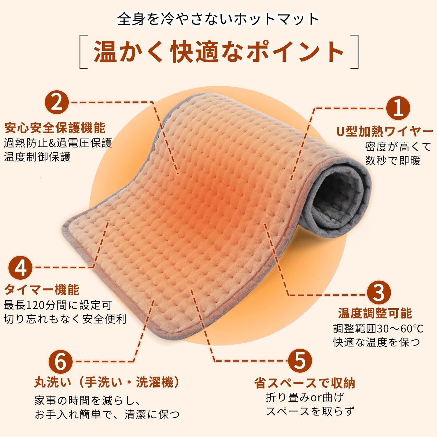 【洗える&省スペースで収納可能】この電気ホットマットは薄くて軽くて、柔軟性に優れます。,折りたたみ可能で、曲げたりしても損傷しません。また、スペースを取らず、収納と携帯に便利ですので、おうちはともかく、オフィスや旅行でも活躍します。手洗い、洗濯機で丸洗いもOKです。(丸洗いの前に、コネクターを取り外す必要があります。)