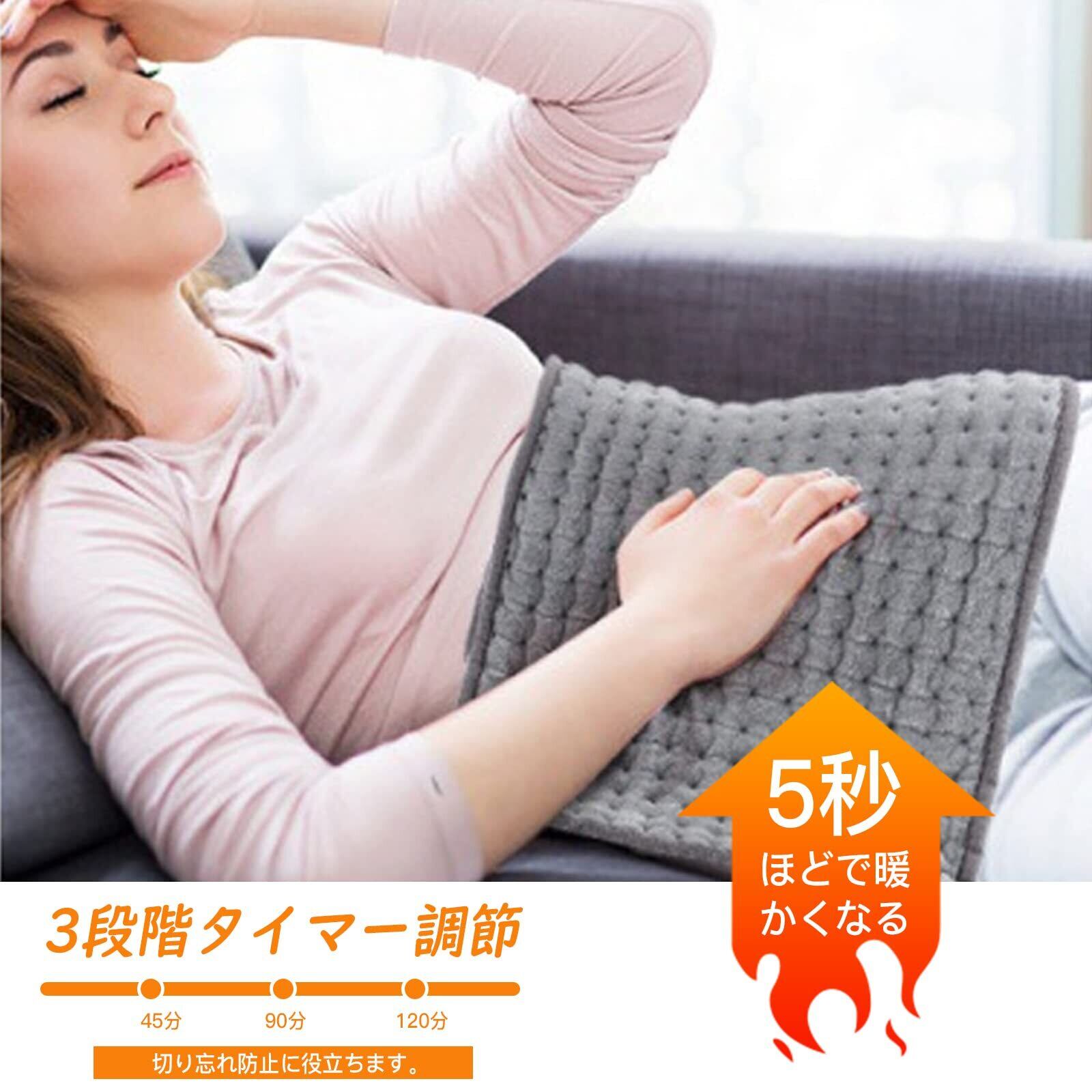 【3段階タイマ一調節&切り忘れ防止】電気ホットマットは45分間-90分間-120分間の3段階のタイマ一選択できます。デフォルトのタイマ一は45分で、90分と120分のタイマ一には設定できます。予定時間が過ぎたら、自動的に電源を切ります。切り忘れても安心です。この機能のおかけで、効果的に電力を節約し、安全性もアップします(火事対策にもなります)。また、PSE認証も取得済みで、安心してお使いいただけます。