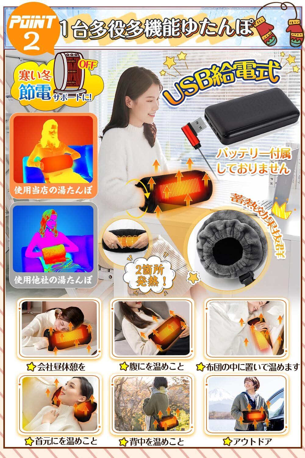 【柔らかいフランネル生地・水洗いOK】防寒グッズ電気マットには保温性の高いフランネル生地を採用し、優しい触感で心地もよく!柔軟性のあり、耐高温、保温性の高く、安全無害のが特徴。電気湯たんぽは重量約350g、サイズ:32*20*9cm、持ち運びが便利です。USBゆたんぽバッテリー付属しておりません、市販の5V/2Aのモバイルバッテリーが使用可能です。