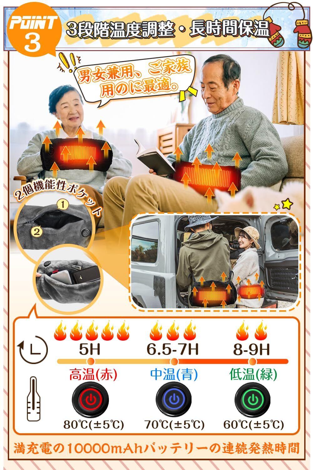 【9時間以上連続発熱可能・3段階温度調整・冷え性対策】USB電気ホットマットは長時間保温するのが魅力!満充電の10000mAバッテリーは連続発熱時間が約5〜9時間とになります。(使用環境、バッテリーの容量、温度の高低によって使用可能時間が異なります)。充電式USB湯たんぽのスイッチは60℃-80℃範囲に3段階の温度調節、「高」「中」「低」三つモードを簡単に変更できます。実際状況や自分好みの暖かさによってご自由に電気あんかの温度を切り替えられます、とても便利です。繰り返し使用できて経済的!万能暖房器具としてお使いいただけ、寒い夜もぬくぬく!
