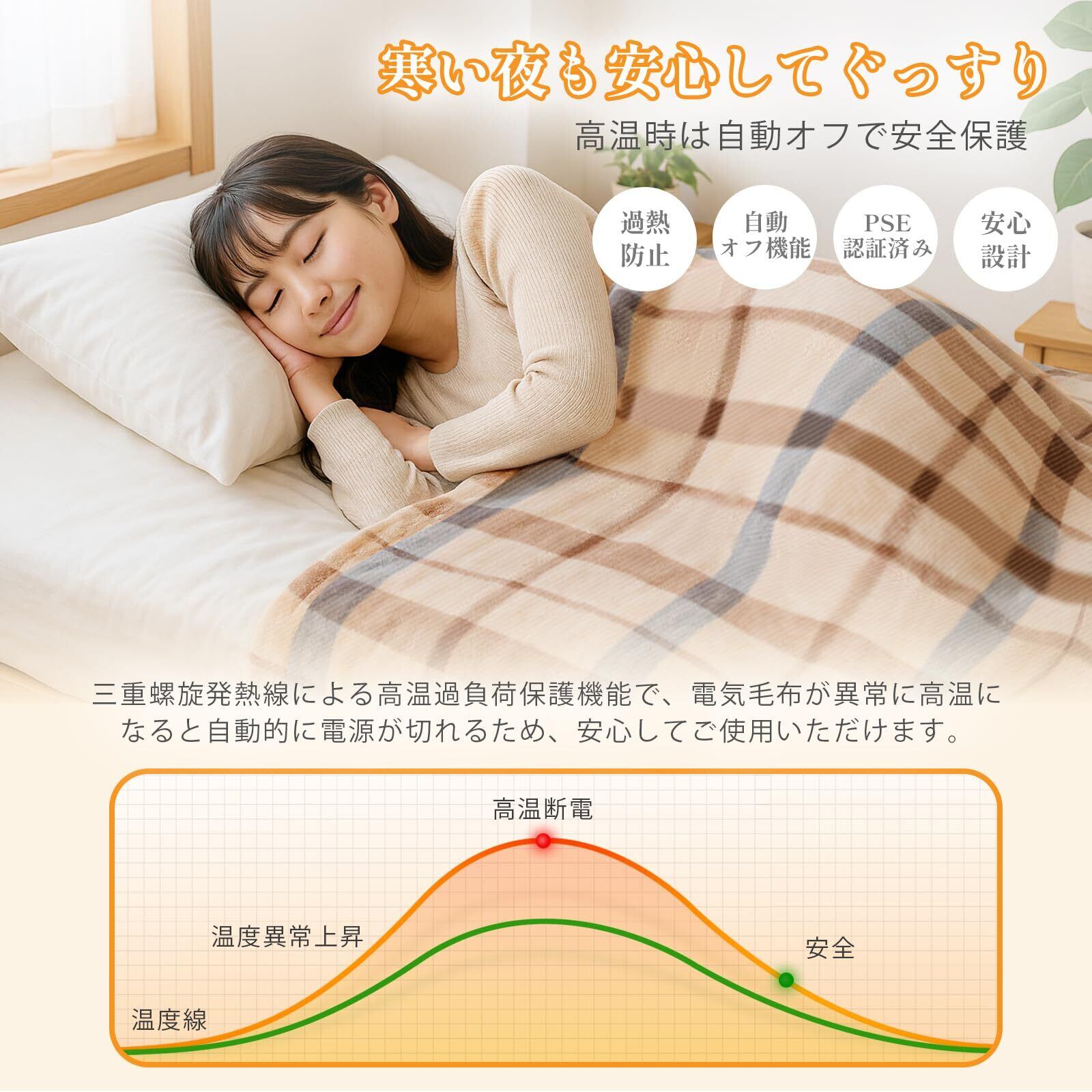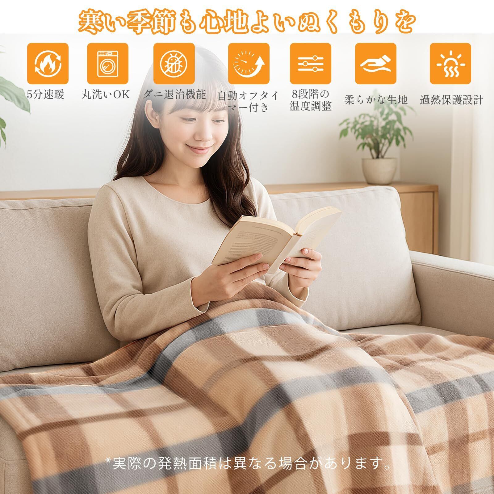 5分で速暖機能:日本製の発熱線を使用し、電源を入れてから30秒で温かさを感じ、5分で体を温めます。寒い夜も快適に過ごせます。