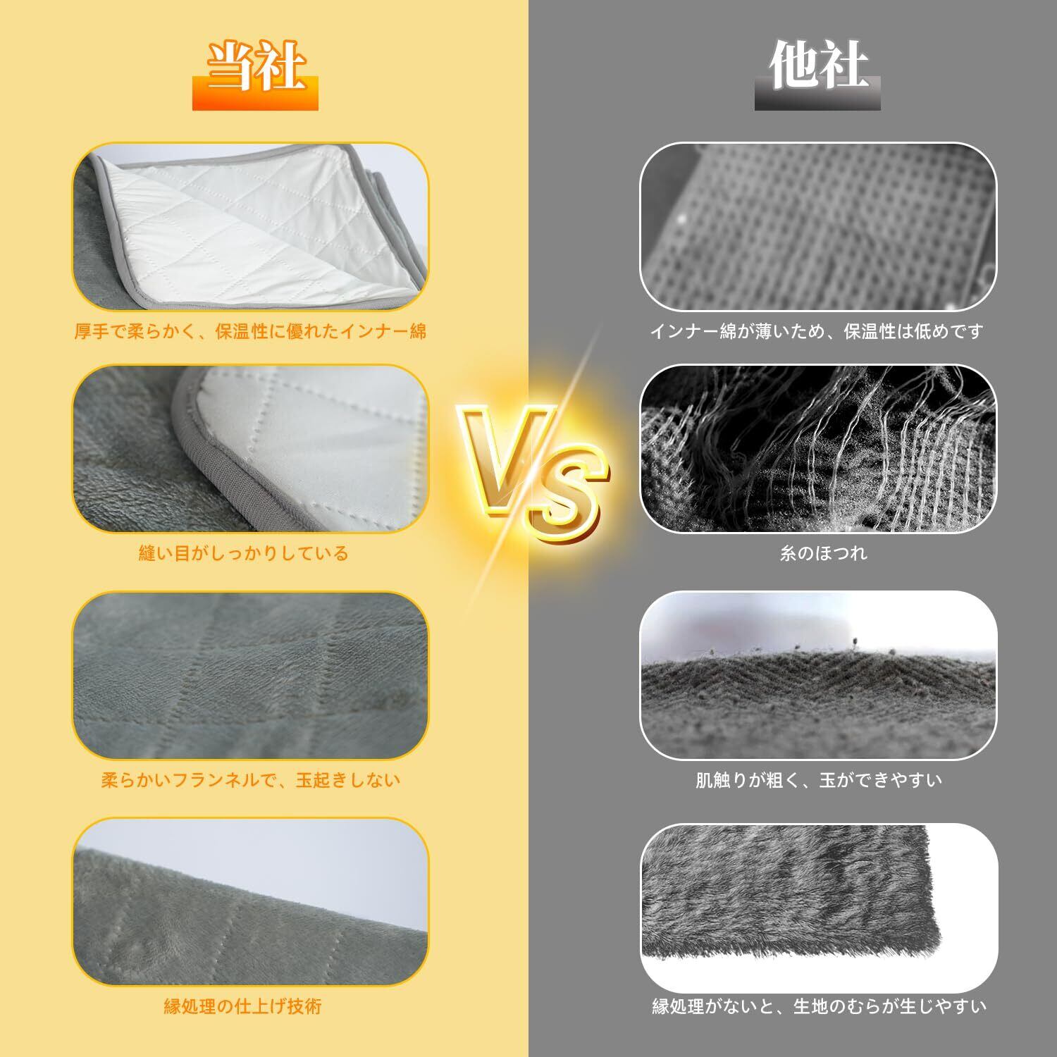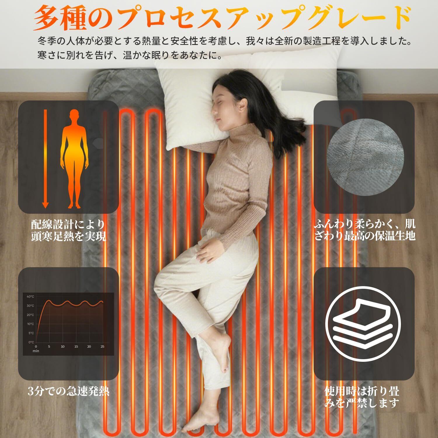 【日本製二重螺旋発熱線】:この電気毛布は日本製の発熱線と二重螺旋製法を採用しており、均一で安定した熱を生み出します。広い面積を効果的に加熱でき、使用寿命が30%延長します。電源を入れて30秒以内に暖かさを実感できます。寒い夜でも、すぐに「敷き布団ヒーター」状態になり、約2分で全身を温め、冬の間ずっと暖かく過ごせます。