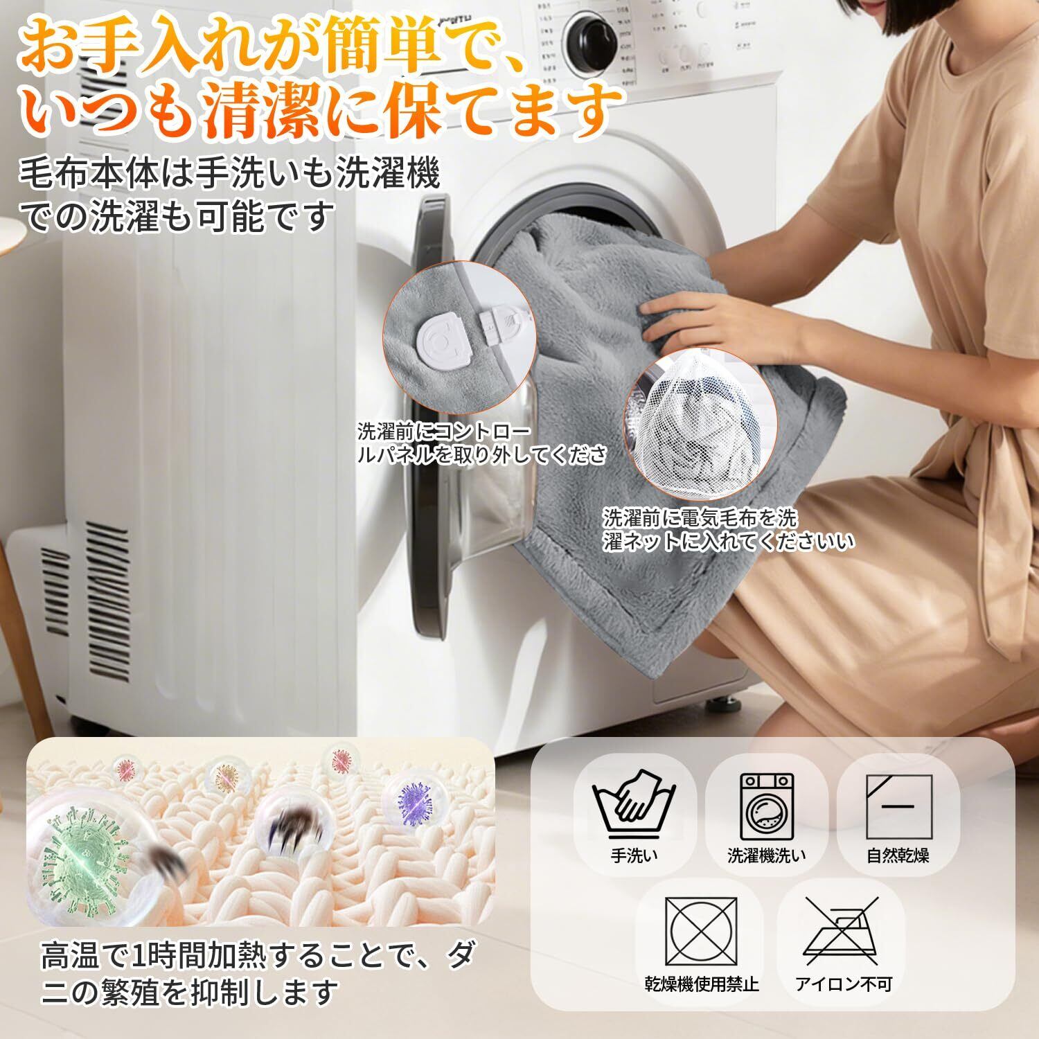 【ダニ除去・洗濯機洗いOK】:この電気毛布はダニ除去機能を搭載しています。ダニ除去ボタンを短く押すと、1時間ダニ除去機能が作動し、黄色ブドウ球菌やマラセチアなどの有害な微生物を99%効果的に除去し、ダニ問題を終わらせ、家族全員の健康的な睡眠を守ります。この電気毛布は洗濯機で洗えます(コントローラーを接続していない状態)。洗濯の際は洗濯ネットをご使用ください。洗濯の際は、毛布コネクタを内側に折りたたんでください。乾燥機は使用しないでください。