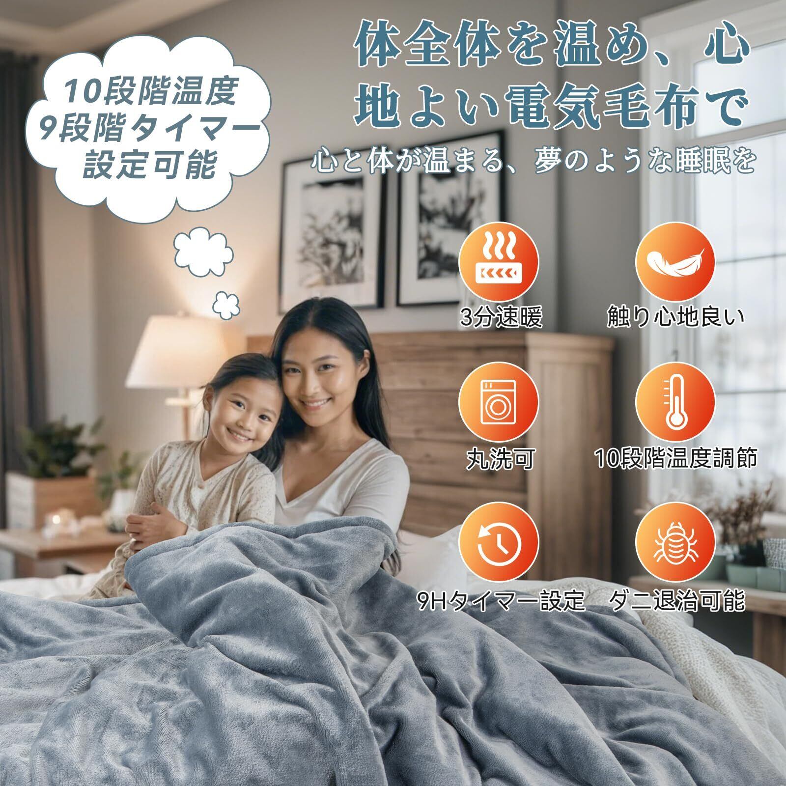 特徴 188cm*130cmの大きいサイズ, 9つのタイマー&10つの温度モード, ふわふわ&肌触りのフランネル素材, 省エネ&操作簡単, 耐久性&洗える