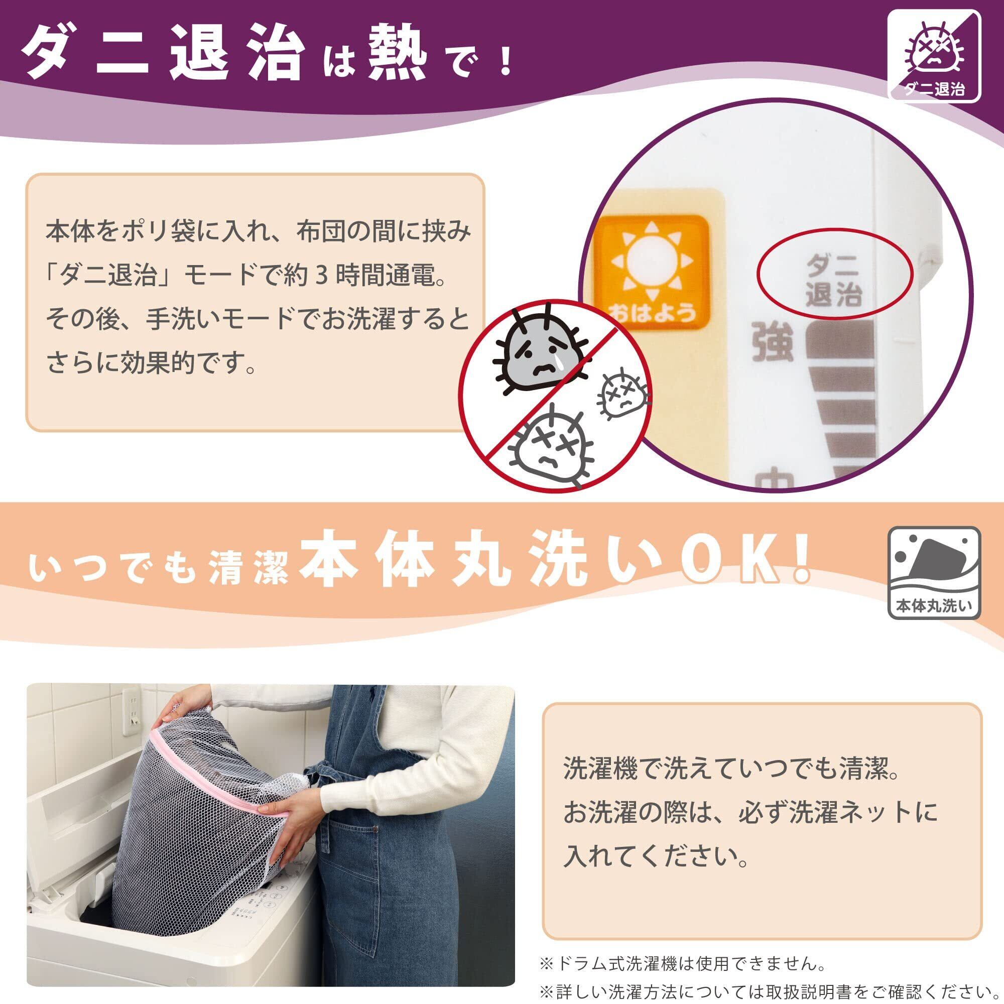 【本体丸洗いOK】本製品は、コントローラーを外すことで洗濯機で丸洗いが可能です。ダニ退治機能も搭載されておりますので、ダニ退治後に丸洗いすることで清潔にご使用になれます。※洗濯の際は、洗濯ネットをご使用ください。※ドラム型洗濯機や乾燥機は使用不可。