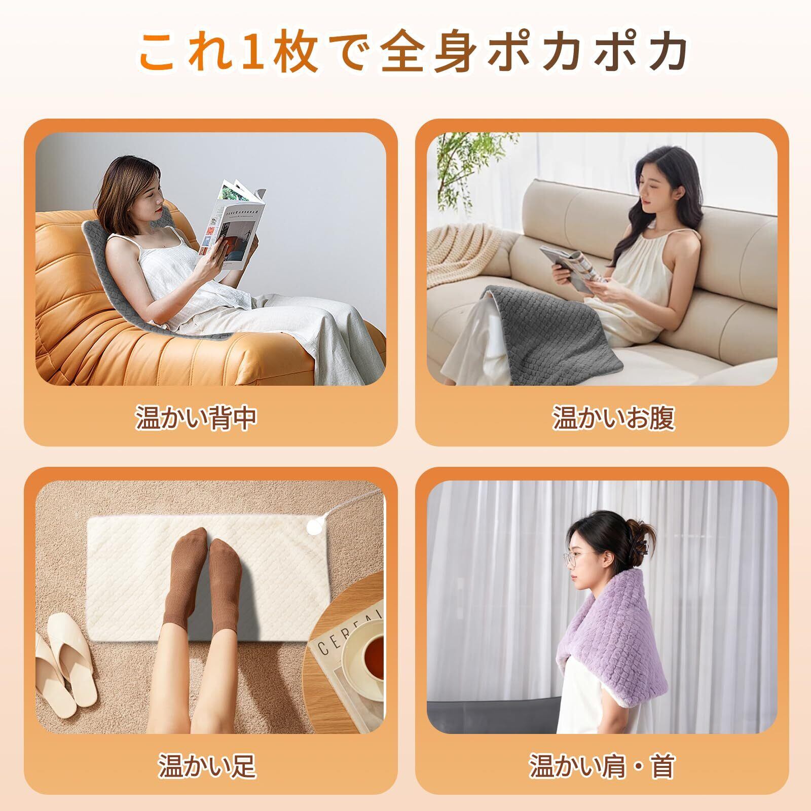 【用途広々&大判サイズ】40×76cmの大判サイズで、お腹・背中・首・肩・腰・脚など広い範囲をしっかりカバーできます。特にお腹まわりや腰などをやさしく温めることで、快適なリラックスタイムをサポート。冷え性対策にも活躍し、寒い季節に頼れるアイテムです。さらに、ご自宅のソファやベッドでの使用はもちろん、オフィスのデスクワーク中、学校での勉強時間、出張やアウトドアなど様々なシーンで活躍。持ち運びやすいサイズ感なので、場所を問わず幅広く使えます。年配の方からお子様まで家族全員で快適にご利用いただける、多用途で実用的なホットマットです。