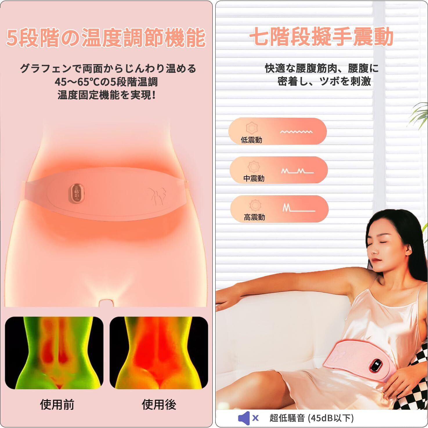 温熱&振動デュアルケア:7種類の振動モードと45℃~65℃の5段階温度調節を自由に組み合わせ。お好みやその日の体調に合わせて、腰とお腹を心地よく温めながら、疲れた筋肉を優しくリラックスさせます。