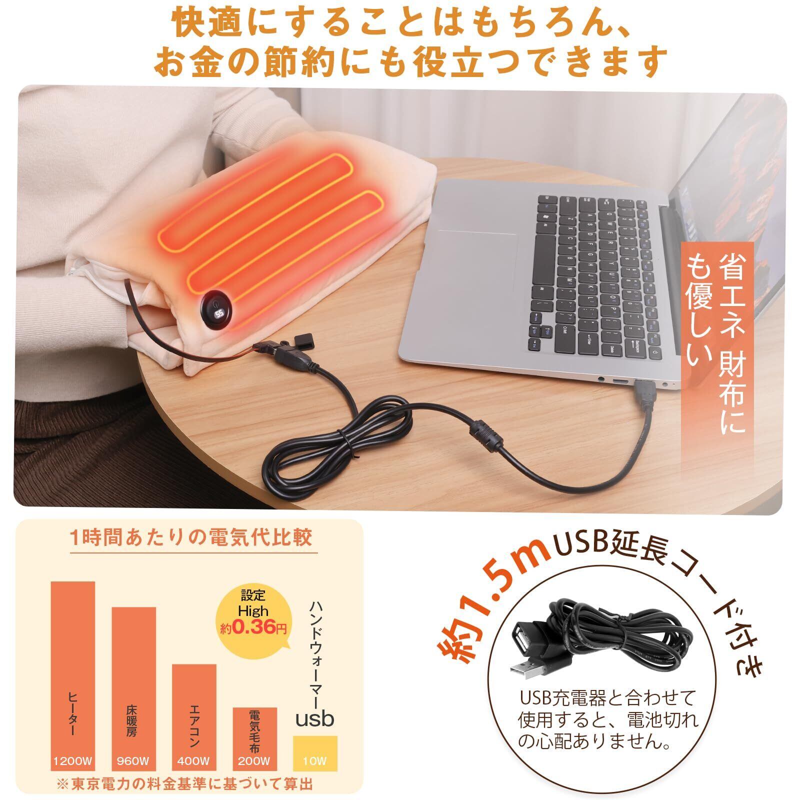 【財布に優しい&洗える再利用できる】ホットマットとして消費電力が約10W、1時間当たりただ0.36円かかります(東京電力の料金基準に基づいて算出)。生活を快適にすることはもちろん、省エネや時間とお金の節約にも役立つ経済的に省エネルギー・エコなホットマットです。このホットマットは手洗いまたは機械洗いサポートします。省エネ・繰り返し使えるな湯たんぽです。水洗い可能、洗濯ネット(別売り)を使って洗濯機を丸洗いも可能です。ご注意:丸洗い前にバッテリー(別売り)を取り外してください。再度使用する前に、 USBケーブルが乾いていることを確認してください。