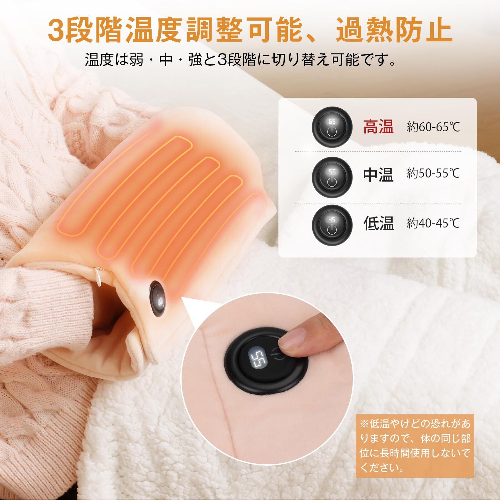 【自由3段温度調節&両面発熱5秒速暖】このホットマットは3段温度調節をサポート、ボタンを3秒長押して、高温段60-65度(赤色)、中温段50-55度(白色)、低温段40-45度(青色)、自分の好みや環境に合わせて温度調節ができます。熱伝導率の良いU型配線と高品質肌にやさしいポリエステル素材を採用し、両面大面積発熱できる、より安全で急速に発熱し、わずか5秒でぬくもりを実感できます。冬場はもちろん、夏場の冷房による冷え対策として年中使えるアイテムです。