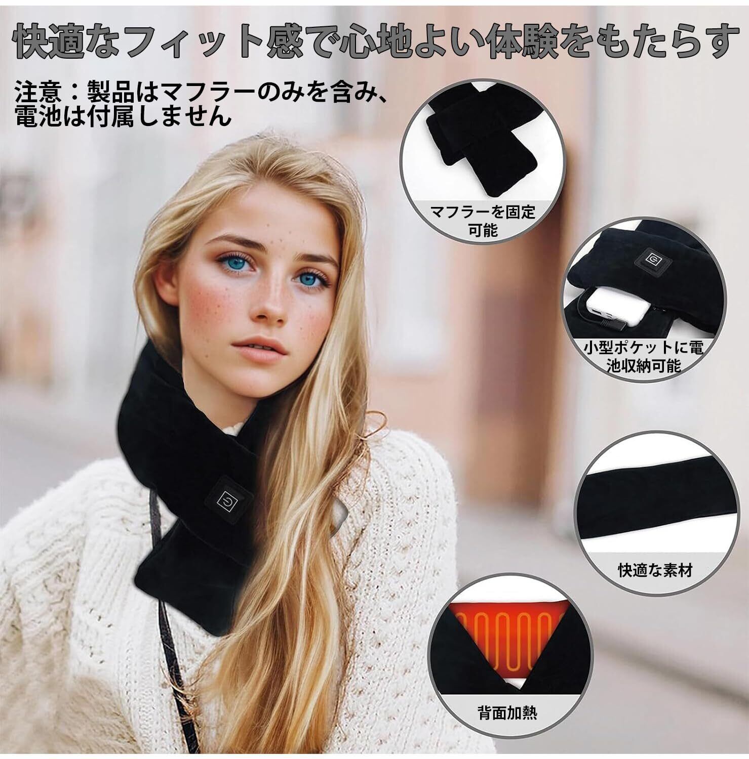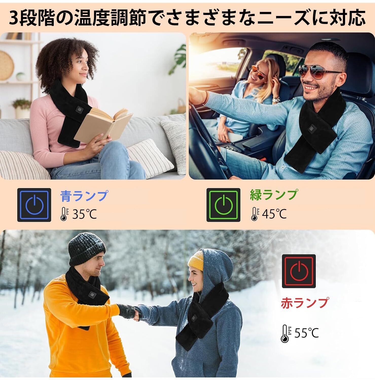 この加熱マフラーは3段階の温度調節が可能で、サイクリング、アウトドア、通勤時に最適です