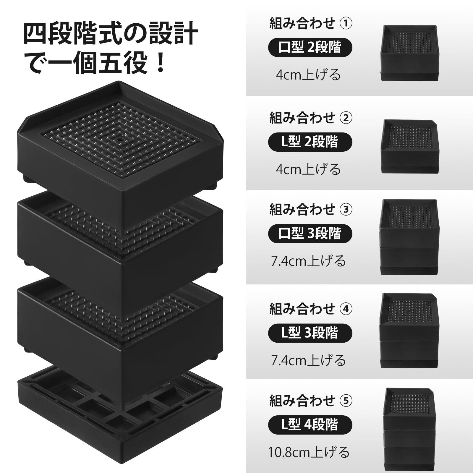 【四段式の設計で一個五役】上段と中段の2層はPP(ポリプロピレン)の素材で、頑丈的で耐久性が抜群です。下段はTPU(ゴム)が採用され、滑り止め加工で耐摩耗性が高いです。四段階式の設計で組み合わせ方法が五つあります:二段式の「口型」かさ上げ台、二段式の「L型」かさ上げ台、三段式の「口型」かさ上げ台、三段式の「L型」かさ上げ台、四段式の「L型」かさ上げ台。それぞれの嵩上げ高さが異なります:4センチ、4センチ、7.4センチ、7.4センチ、10.8センチ。おニーズに応じて、組み合わせて使えます。