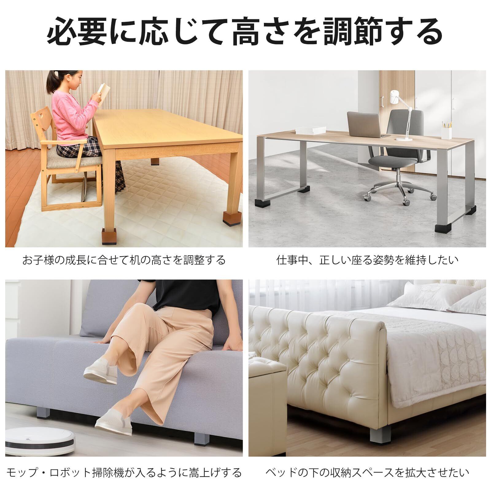 【かさ上げに】テーブル脚やコタツ足などの継ぎ足しです。こたつや座卓の各脚に本品をはめ込み、高さに4センチ・7.4センチ・10.8センチ上げると、 寝転がっても腰が当たらずらくらく。洗濯機や棚をかさ上げたら、モップ・クイックルワイパー・ロボット掃除機が入るのでホコリ取りには問題ないです。さらに、ベッド・ソファーを高くしたら収納スペースを拡大することもできます。