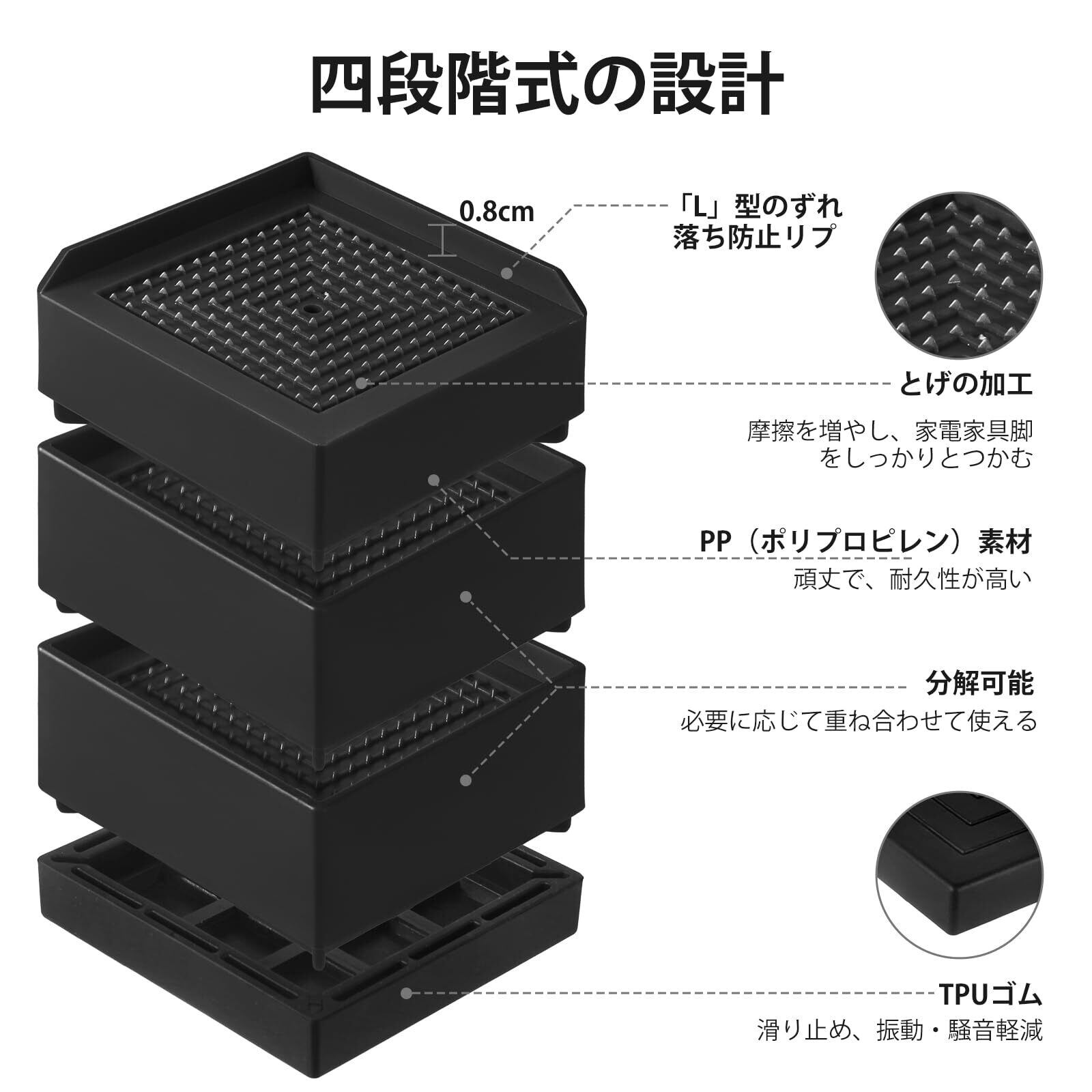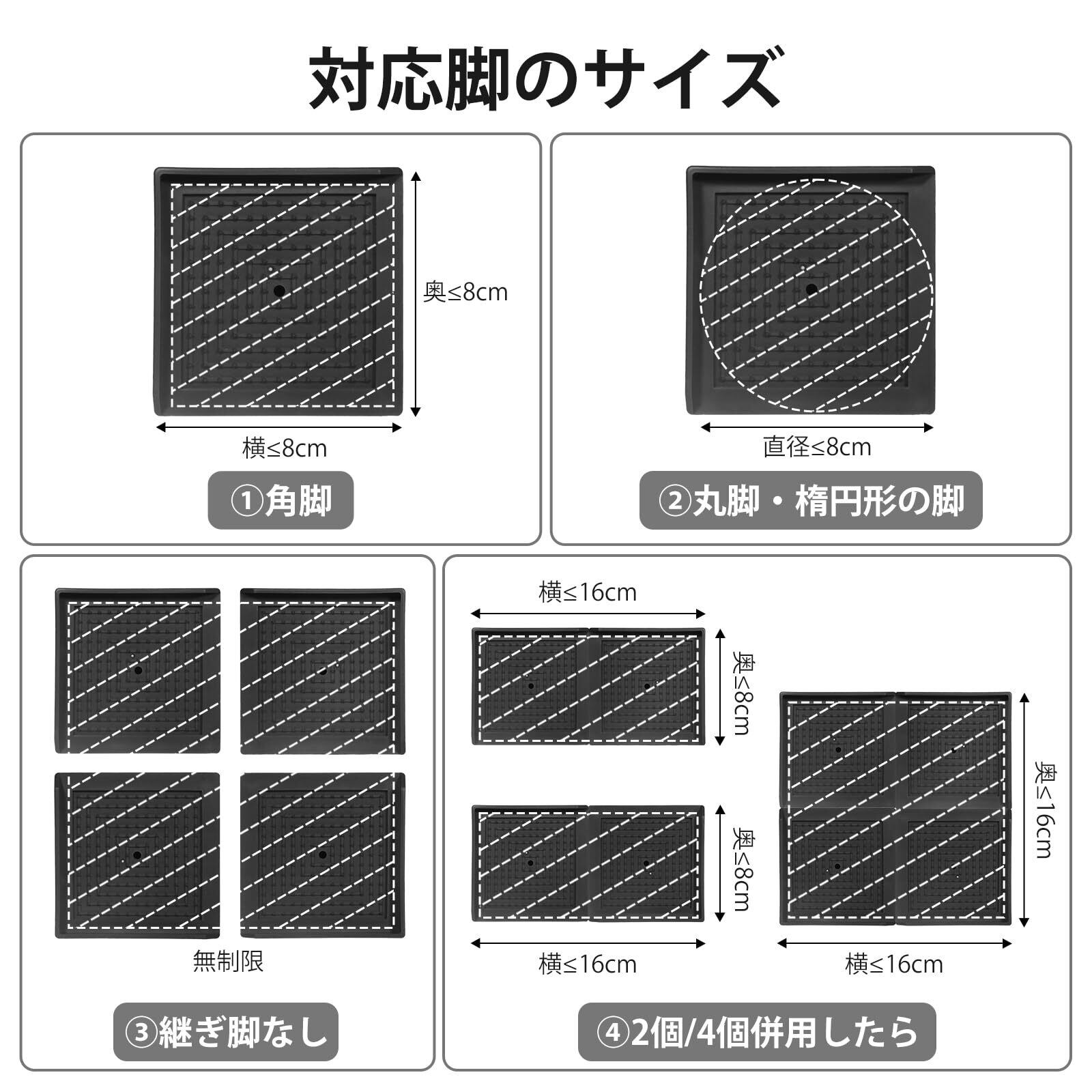 【独特の設計】ズレ落ち防止リプの2面の切り欠きが設計され、冷蔵庫や棚などの足なしの家電・家具を載せることができますし、天面にたまった水が排出することもできますし、防錆防湿の役に立っています。また、2個あるいは4個を併用したら、大きめサイズの足(最長辺は16cmまで)にも対応しています。