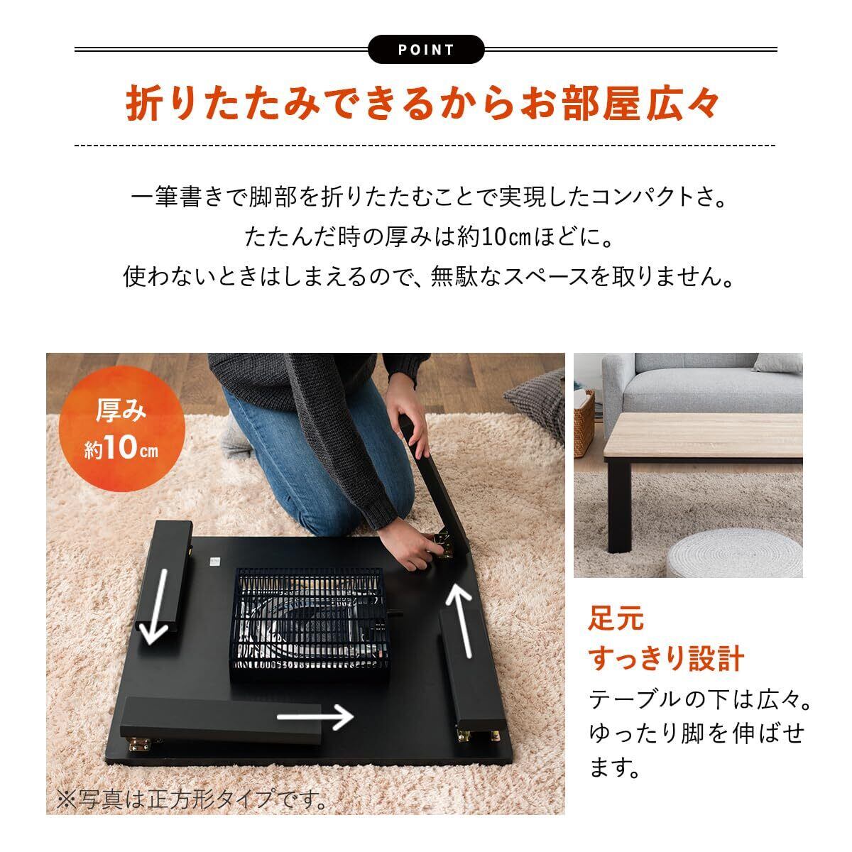 こたつ布団を外せば、中使えるローテーブルとして大活躍。畳んだ時の厚みは約10cmのコンパクトサイズで、収納する場合も便利です。