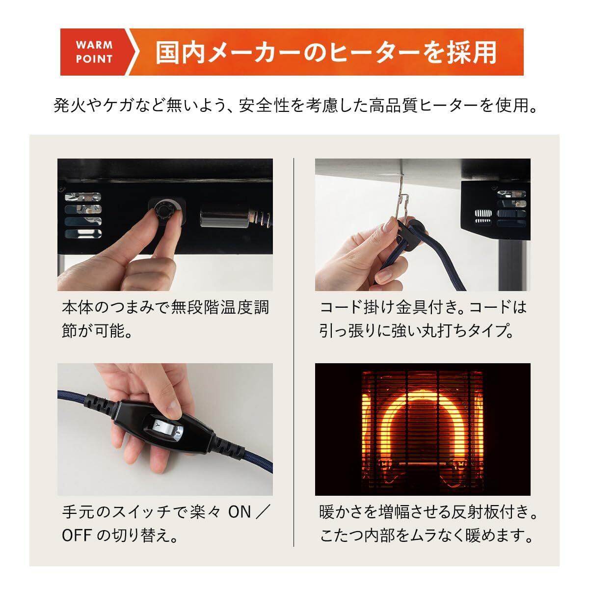 シェアNo.1を誇る国内メーカーのヒーターを採用しました。温かさ・安全性ともに高レベルなのは、日本製の証です。