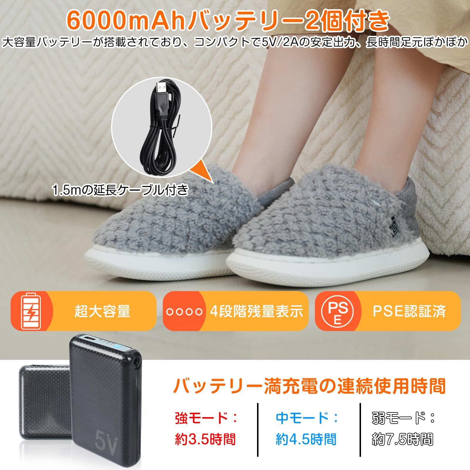【大容量6000mAhバッテリー2個付き】2024新版フットウォーマーはDC 5V/2.1A安定出力の6000mAhバッテリーが2個付属しており、高温モードで約3.5時間、中温モードで約5時間、低温モードで約7.5時間の連続使用が可能です。1.5mのUSB延長ケーブルも付いており、バッテリーがスリッパの収納ポケットに入れなくても気軽に足を温めてくれます。