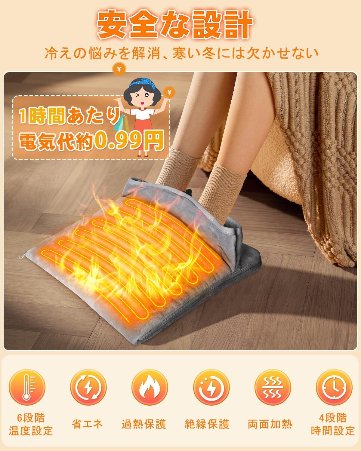 【1時間電気代0.99円!】最新改良型なフットウォーマー本体がわずか45Wの消費電力になり、一時間当たりの電気代は約0.99円で、冷たい冬でも電気代に悩まず、いつでも暖かいフィット感を楽しめます。強化された単回路U字加熱ワイヤーがより素早い加熱速度を提供する上に、圴一な加熱を実現、多重の温度制御機能と保護機能より安心で安全に利用いただけます。注意:人がいない時と高温物体の側では本製品を使用しないでください。