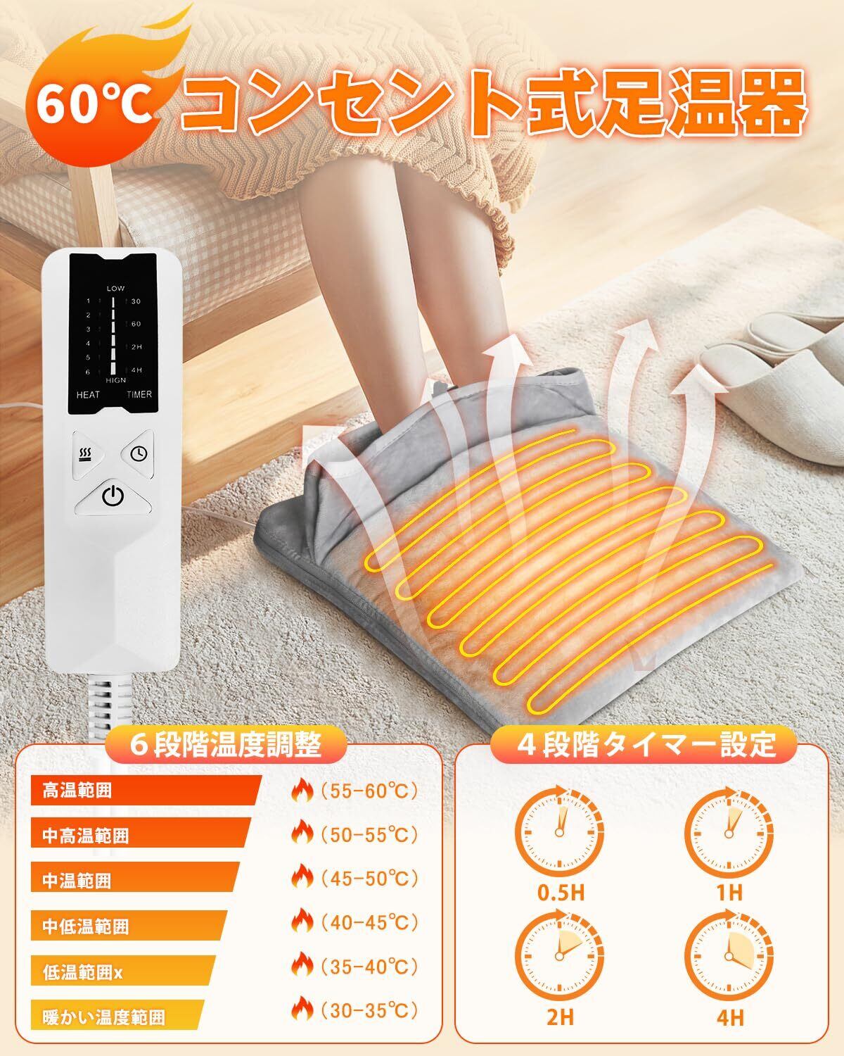 【最高加熱60℃】最高加熱温度は60℃まで調節可能、寒い冬場の在宅ワークや勉強に適応、足元を温かく包まれ、誰でも簡単に操作できるコントローラーで加熱温度を30-35℃⇨35-40℃⇨40-45℃⇨45-50℃⇨50-55℃⇨55-60℃まで細かく調節でき、ご利用の環境や地域の温度より適切な温度を選べます。さらに、30min⇨1H⇨2H⇨4Hのタイマー機能が搭載、希望の加熱時間を設定できます。設定の加熱時間になると製品は自動に電源OFFになり、加熱時間を設定してない場合は4時間後自動オフになり、消し忘れの心配はない。
