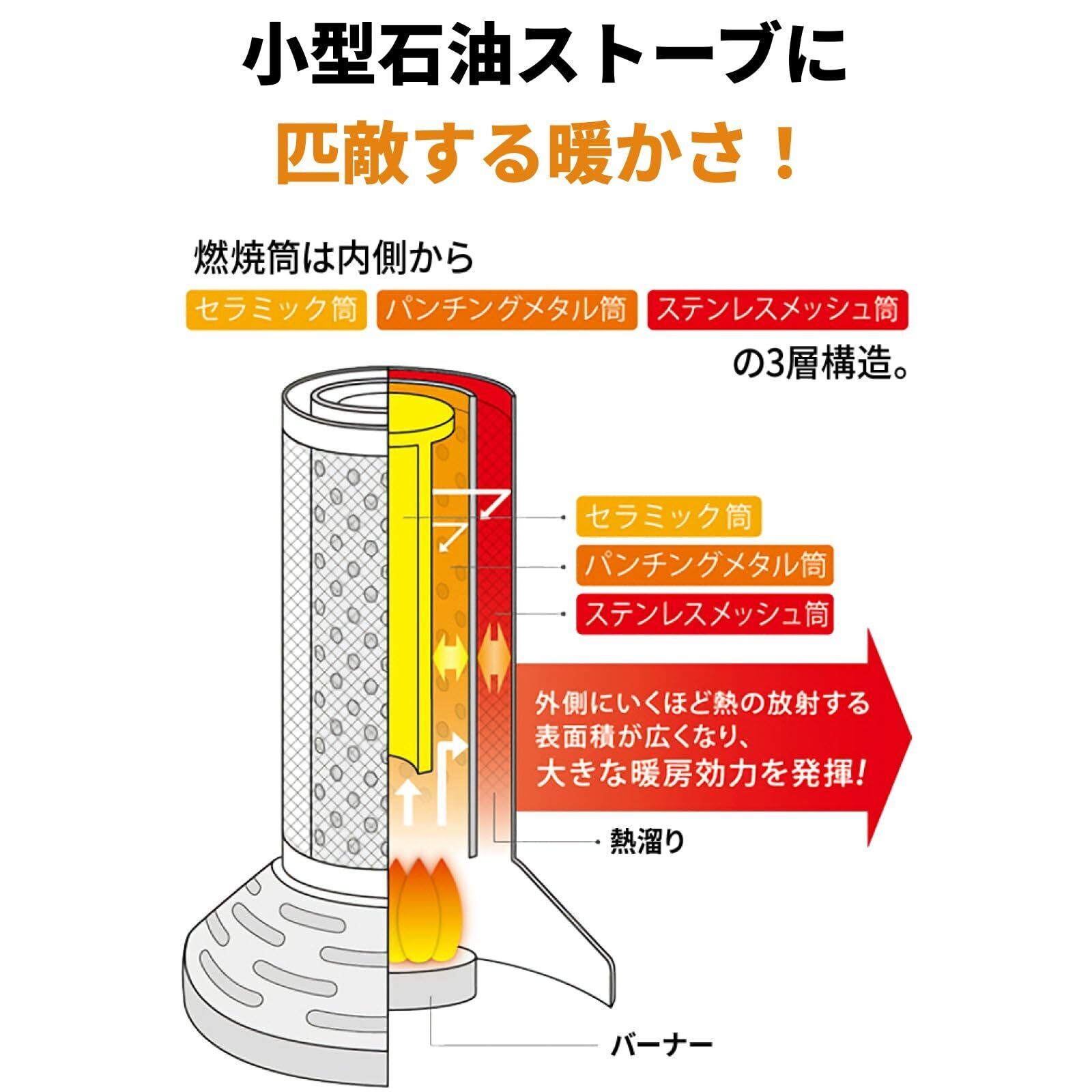 【火力】約1.35kW (約1,150kcal/h相当) ON・OFF式(火力調節あり) 『熱溜め燃焼筒』によって少ないガス消費量でも暖かい暖房効力を発揮