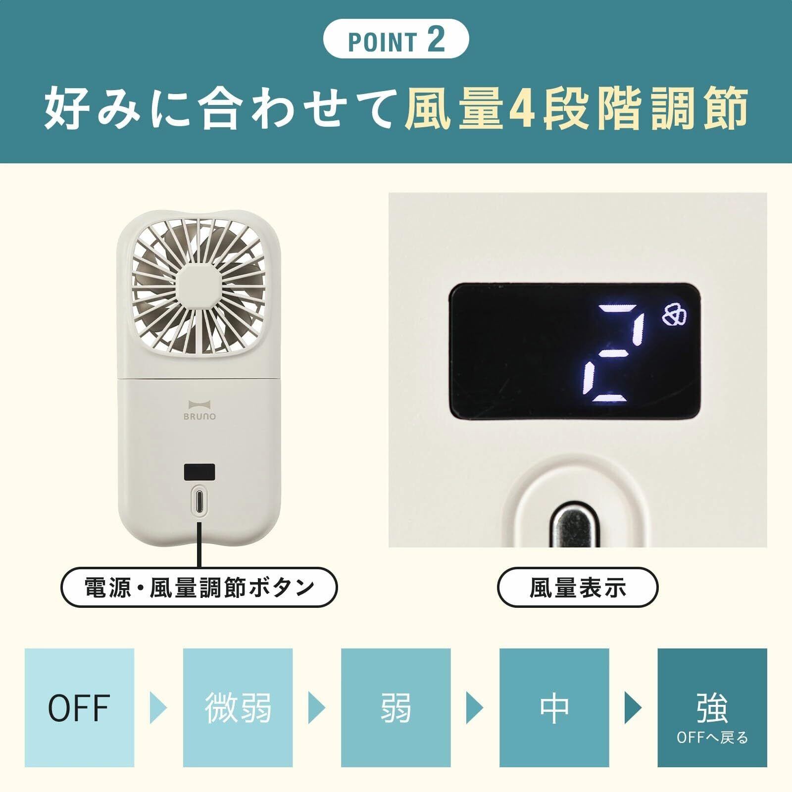 風量4段階切替(微弱、弱、中、強)、モバイルバッテリー、スタンド機能